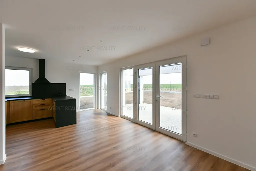 Dispoziční řešení domu je následující. Za vlastním vstupem do jednotky domu se nacházíme v zádveří, kde jsou vstupní dveře do koupelna s WC, dále technické místnosti, pracovny / šatny a jeden samostatný menší pokoj vhodný jako hostinský nebo pracovna. Dále otevíratelnými dvoukřídlími dveřmi vstupujeme do obývacího pokoje s výhledem na terasu a zahradu. Součástí obývacího pokoje je kuchyňský kout se všemi spotřebiči v ceně!