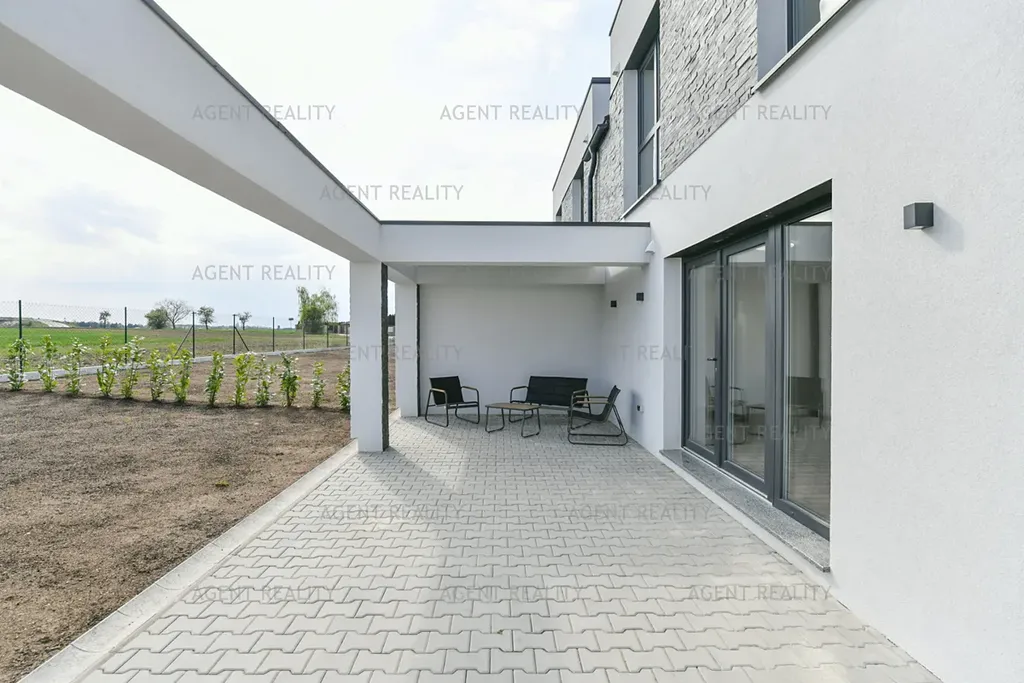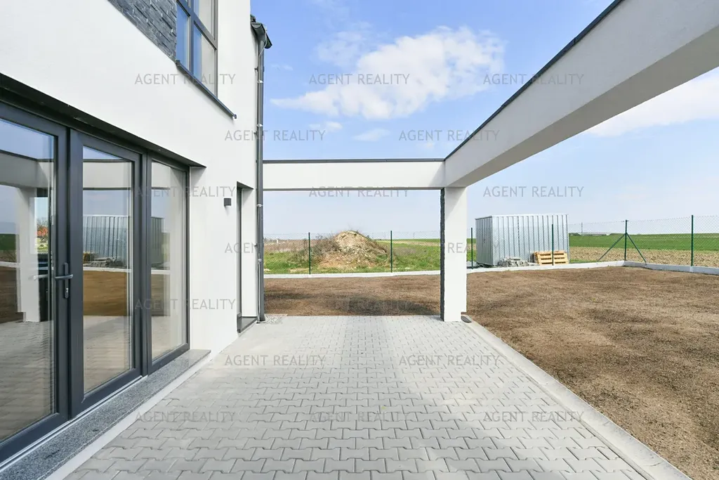 K domu jednotky patří oddělaná vlastní zastřešená terasa z betonové zámkové dlažby na kterou vejdete přímo dveřmi z obývacího pokoje. Terasa je orientována na JV slunečnou stranu do zahrady, která je již připravená a zaseta trávním semenem.