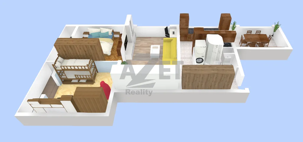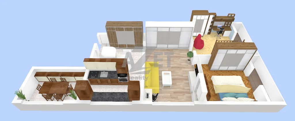 Jak již bylo zmíněno, největší přelstí bytu je jeho variabilita s možností změny umístění pokojů, například.: