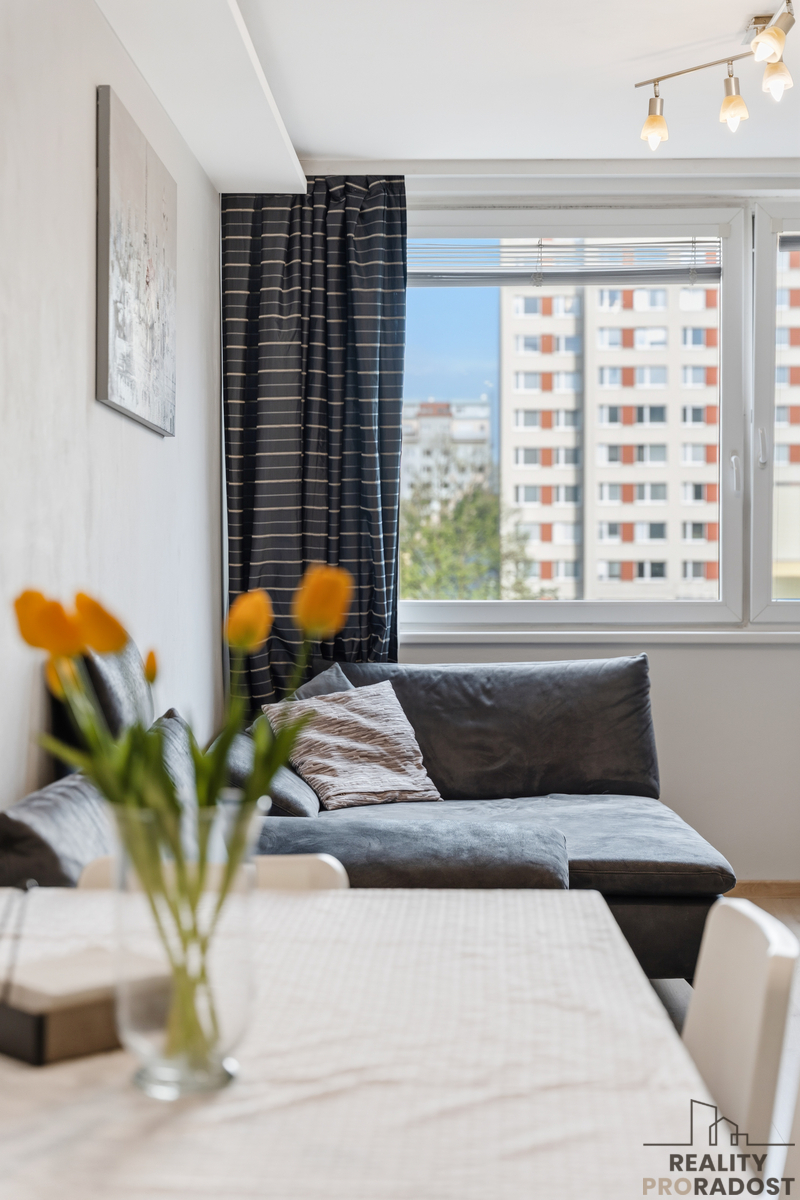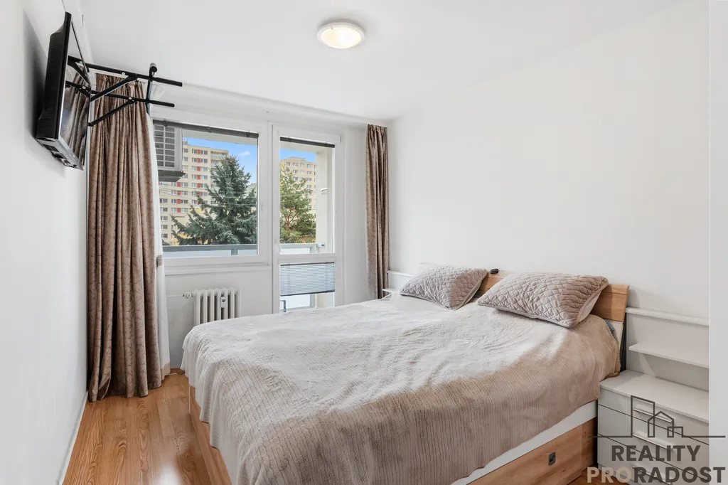Byt je situován ve 2. patře panelového domu s výtahem. Dispozice zahrnuje dvě samostatné ložnice, prostorný obývací pokoj s plně zařízenou kuchyňskou linkou, koupelnu se sprchovým koutem i vanou, samostatné WC, předsíň a balkon. Velkým bonusem je klimatizace, kterou oceníte zejména během letních měsíců. K bytu náleží také sklepní kóje.