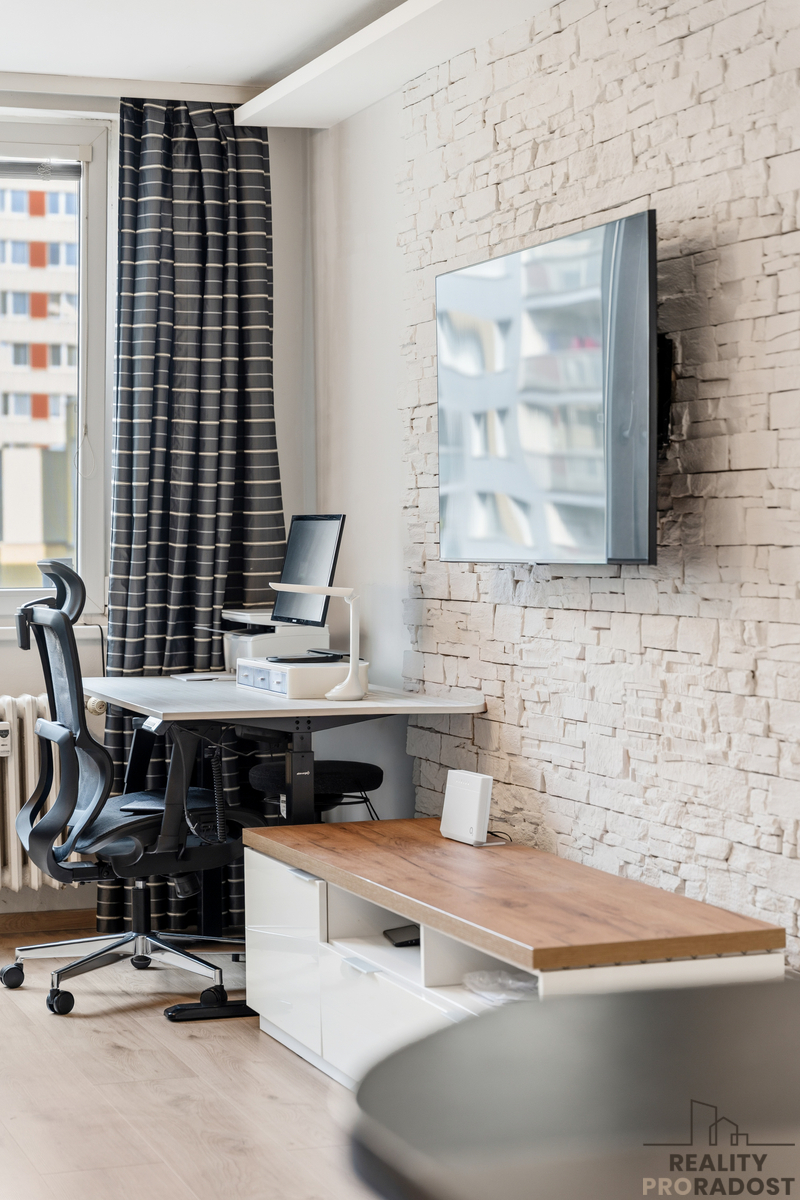 Oproti fotografiím si majitel ponechá část sedací soupravy v obývacím pokoji, televizi a pracovní stůl, v ložnici bude odvezena také televize. Po dohodě s vážným zájemcem je možné zajistit i odstranění dalšího vybavení bytu.