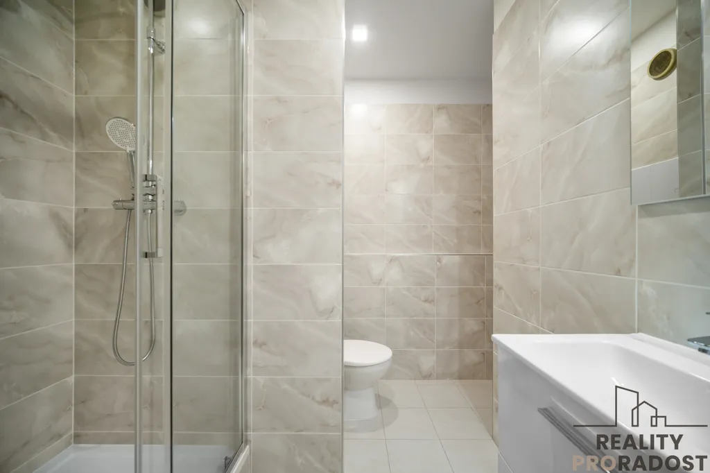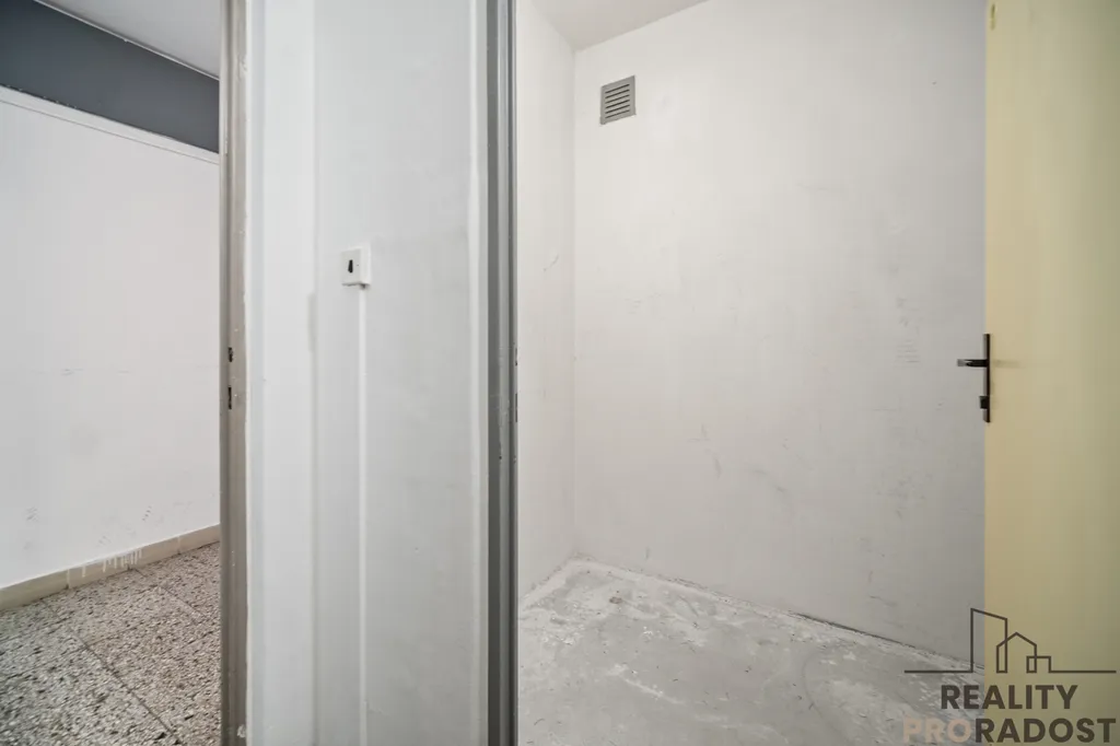 Vstupem se dostanete do chodby, kde se po levé straně nachází prostorná šatna. Napravo je menší komora, za kterou je situována koupelna se sprchovým koutem, toaletou a přípravou na pračku.