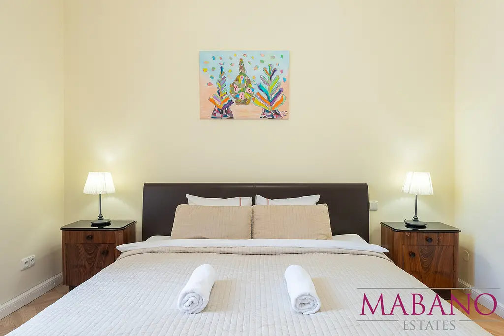 The interior consists of an entrance hall with a built-in furniture, built-in washing and drying machine, a bathroom with a shower, a separate toilet, kitchen set in a high standard, a bedroom with an orientation to a calm courtyard, a living room with an orientation to the street. There is an oak wooden floor over the entire apartment. Radiator and water heating are provided by own gas boiler.