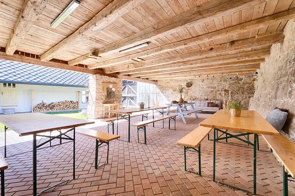 Dvůr uzavírá velká stodola. V její přední části se nachází kryté venkovní posezení ideální pro setkávání s rodinou a přáteli, doplněné o venkovní WC a sprchu. Zadní část stodoly je využívána jako garáž, aktuálně sloužící jako herna. Pod stodolou se nachází menší klenutý sklep.