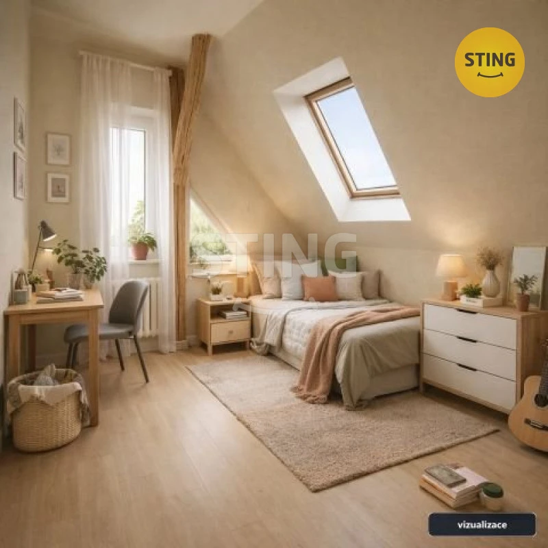 2.NP (podkroví) sestává ze 3 pokojů (ložnice a 2 dětské pokoje) další koupelny s vanou a WC. V mezipatře je vstup na balkon.