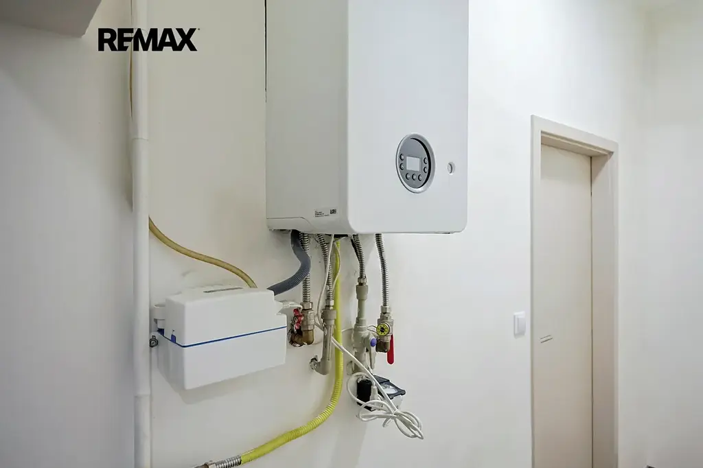 Podlahové vytápění a ohřev vody zajišťuje plynový kotel zn. Vaillant. Do bytu je zavedeno internetové a TV připojení od společnosti O2.