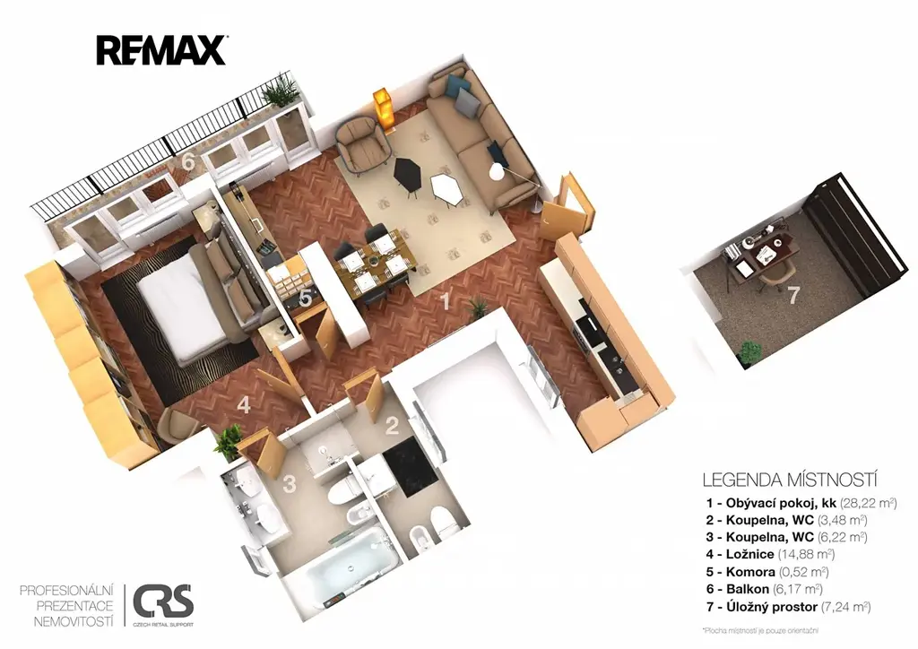 Dominantou celého bytu (celkově 67,8 m²) je velký obývací pokoj s dubovými parketami, ze kterého vede vstup na lodžii. Lodžie je přístupná rovněž z ložnice, ve které jsou zajímavě řešené vestavěné skříně.