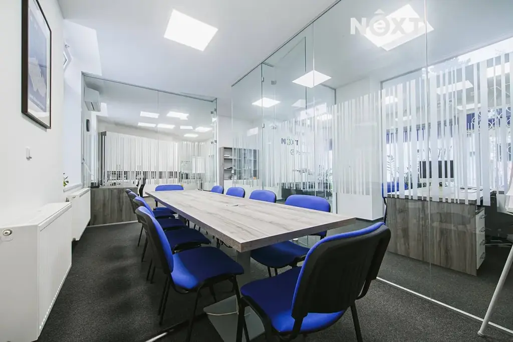 Moderní interiér je řešen v moderním open-space konceptu s elegantními skleněnými příčkami, které rozdělují prostor do funkčních zón, aniž by narušovaly pocit otevřenosti a světlosti. Skleněné příčky dodávají kanceláři profesionální, čistý a reprezentativní vzhled – přesně takový, jaký dnes moderní firmy vyžadují.