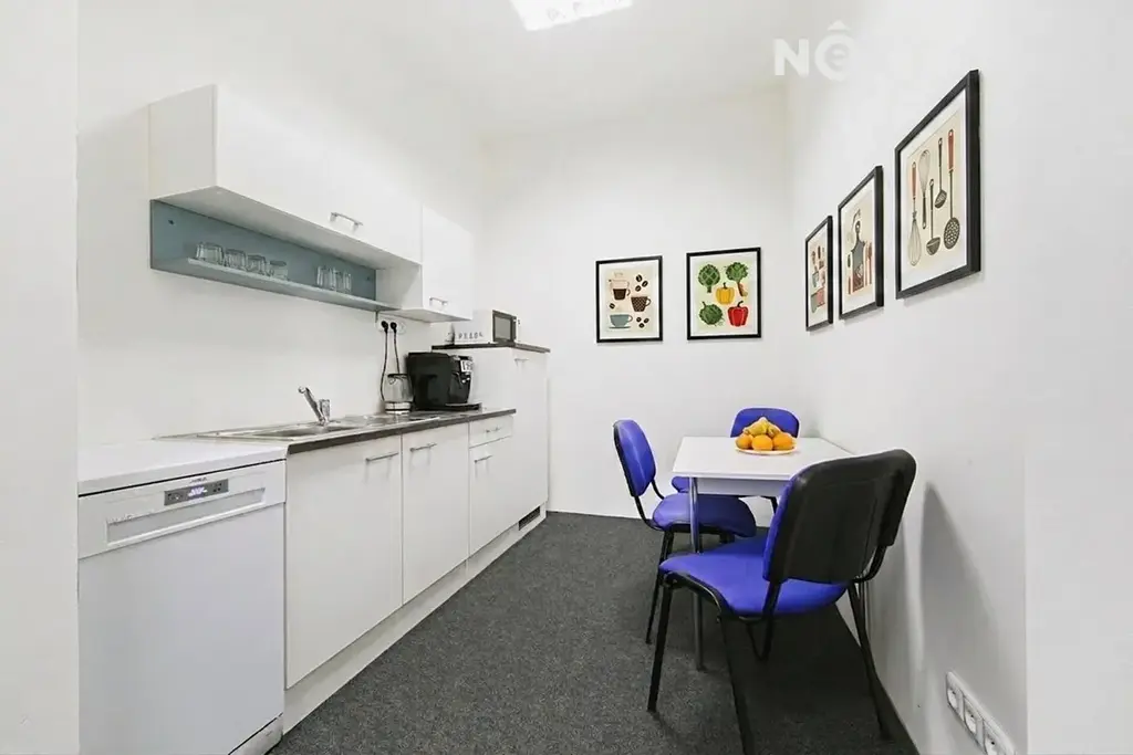 Pro pohodlí vašich zaměstnanců je součástí prostor plně zařízená kuchyňka, která disponuje lednicí, myčkou nádobí a mikrovlnnou troubou.