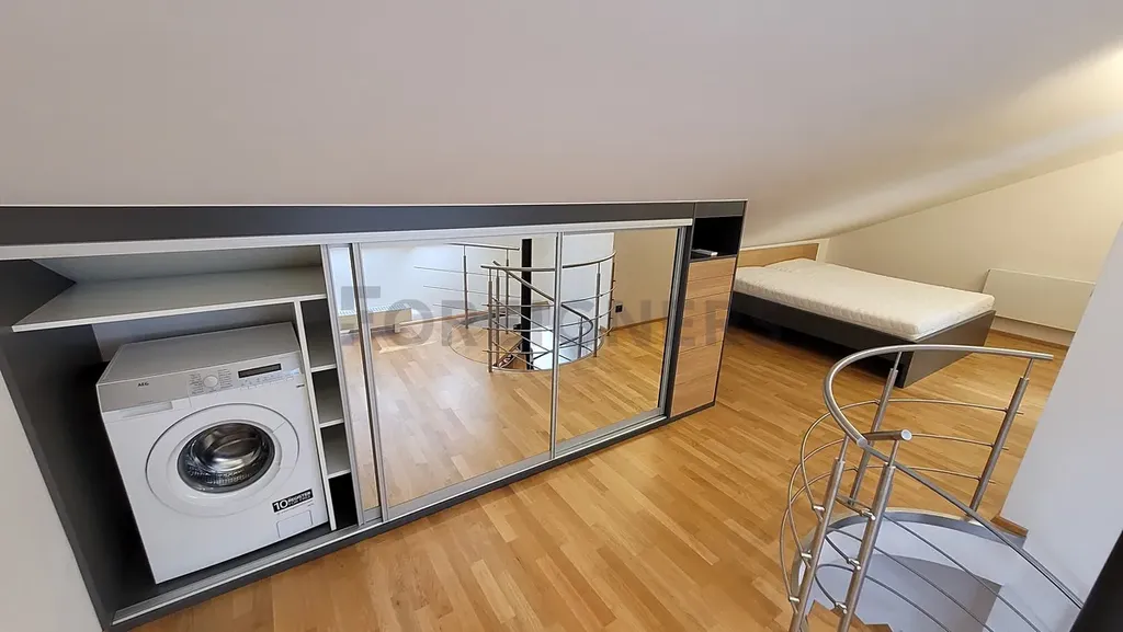 Ložnice je situována v horním patře a nabízí manželskou postel, šatní skříň s pračkou.