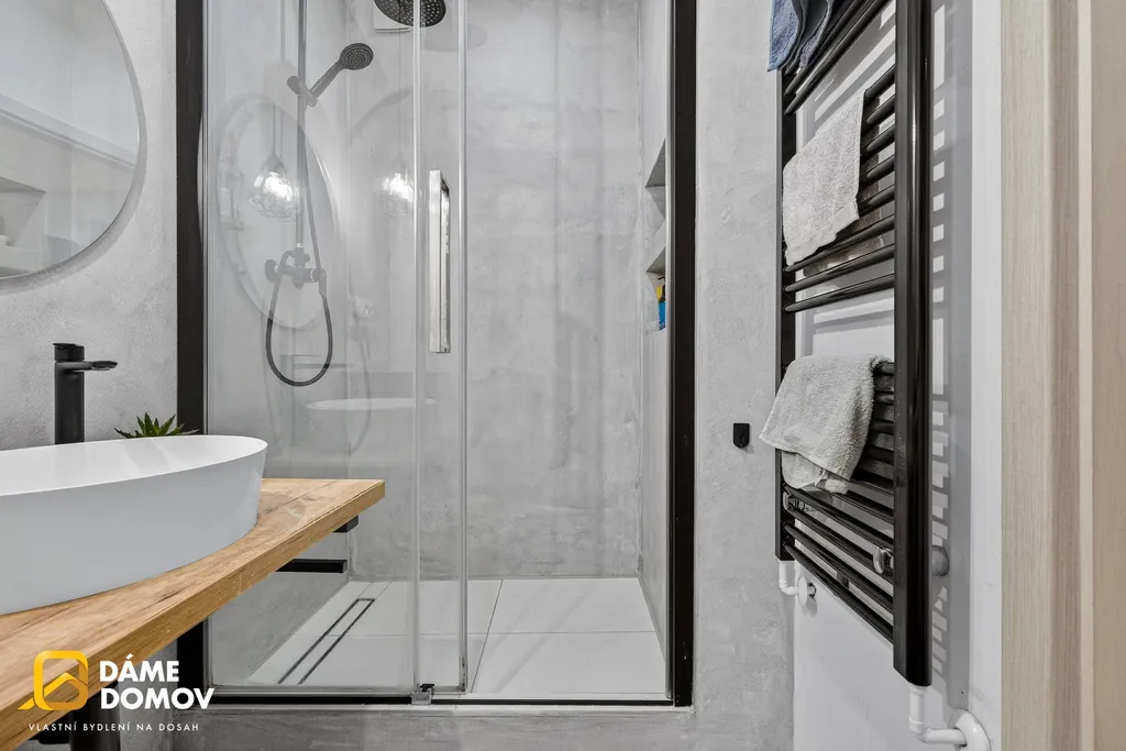 Koupelna je vybavena sprchovým koutem a kombinovanou pračkou se sušičkou. Příjemným bonusem je balkon s výhledem do okolí, který poskytuje ideální místo k relaxaci.