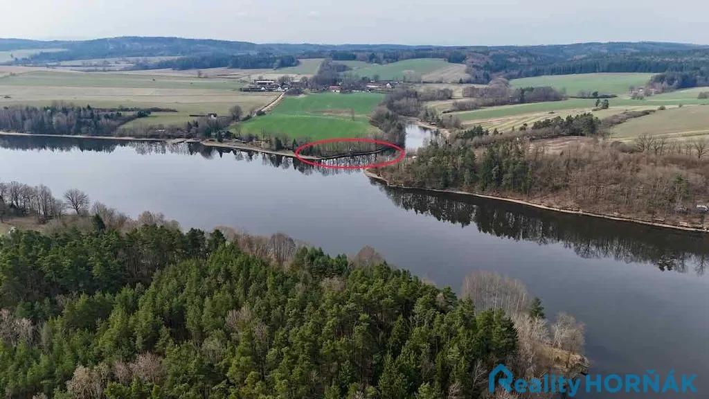 Pozemek se nachází v odlehlé části přehrady bez přímého příjezdu po pevnině. Přístup je řešen po vodě – z místa, kde lze zaparkovat vozidlo, je vzdálenost k pozemku přibližně 290 m.