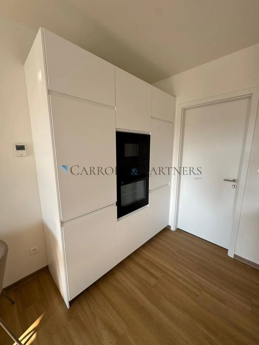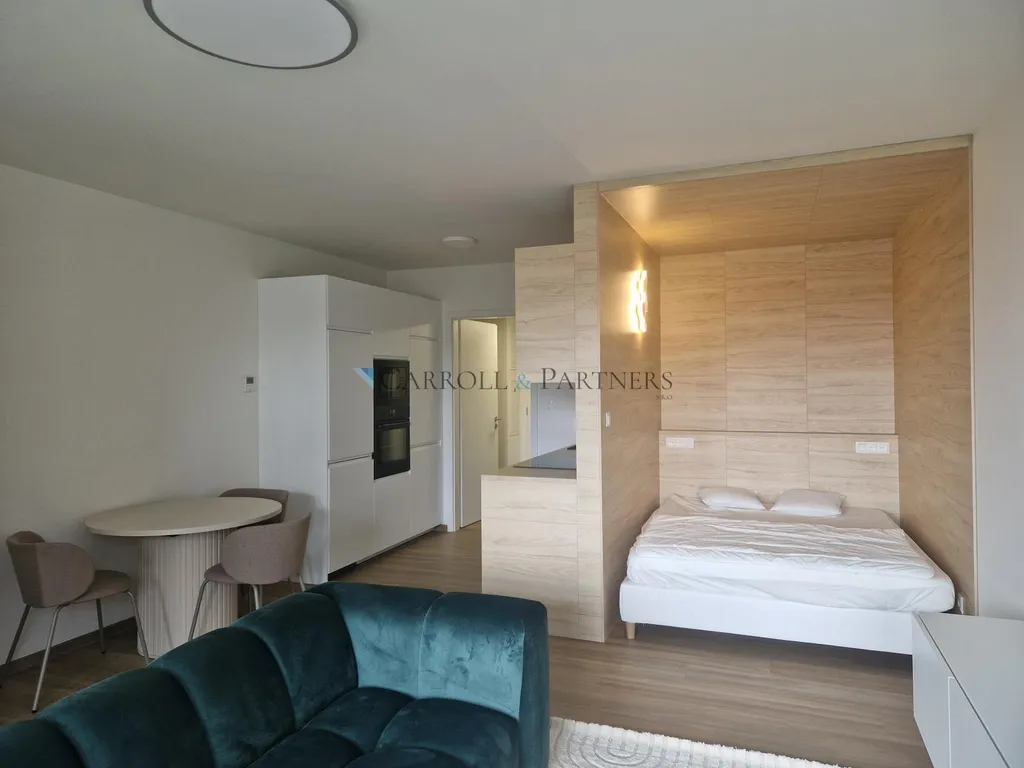 Kuchyň je plně vybavená vestavěnými spotřebiči (varná deska, trouba, mikrovlnka, lednice i myčka), takže se můžete hned pustit do vaření. Součástí bytu je také rozkládací jídelní stůl se židlemi, prostorné skříně, pohodlný gauč, stolek s televizí, koberec a postel o šířce 160 cm v oddělené spací zóně. Podlaha je vinylová a teplo je zajištěno podlahovým vytápěním i v koupelně.