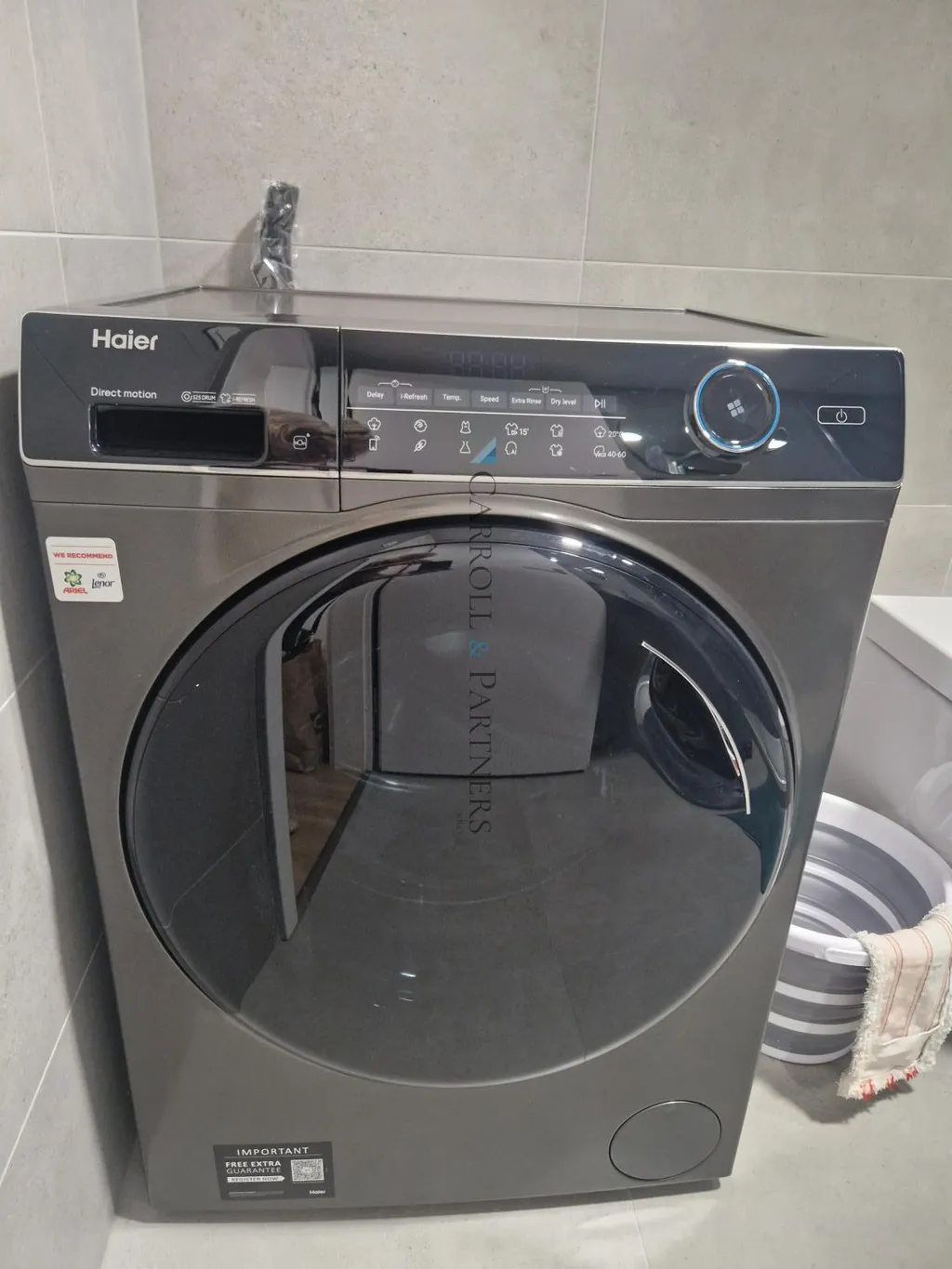 Koupelna je moderní a praktická, se sprchovým koutem, toaletou a pračkou se sušičkou. Nechybí ani umyvadlo se skříňkou, zrcadlo a dostatek úložného prostoru.