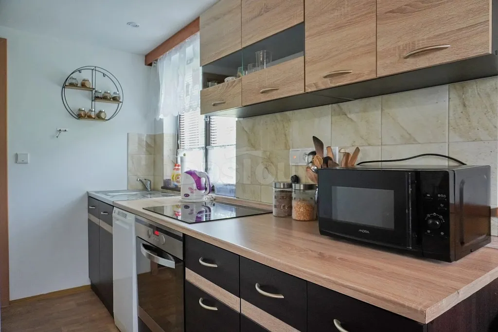 V přízemí se nachází vstupní chodba, plně vybavená kuchyň s jídelním koutem, obývací pokoj s krbovými kamny, koupelna se sprchovým koutem a toaleta.