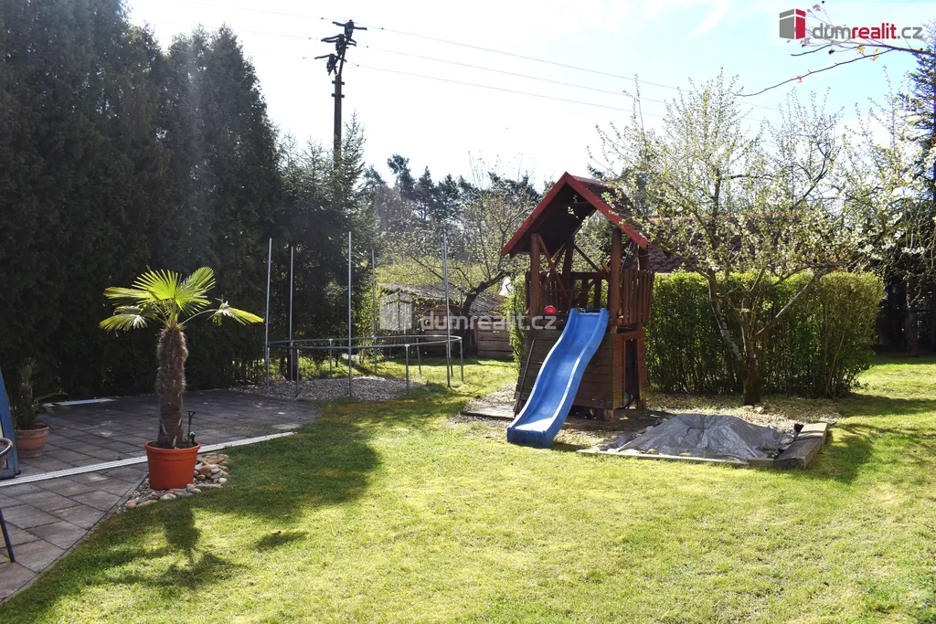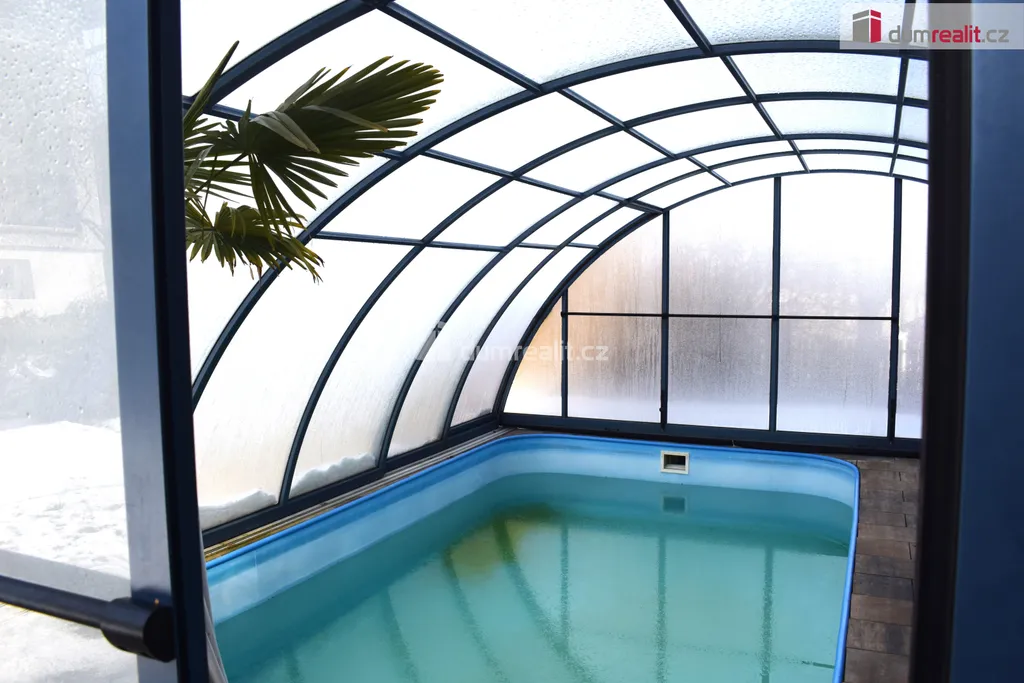 Zahrada je udržovaná - venkovní bazén, pergola, jezírko, dřevník, skleník, studna a přístřešek.