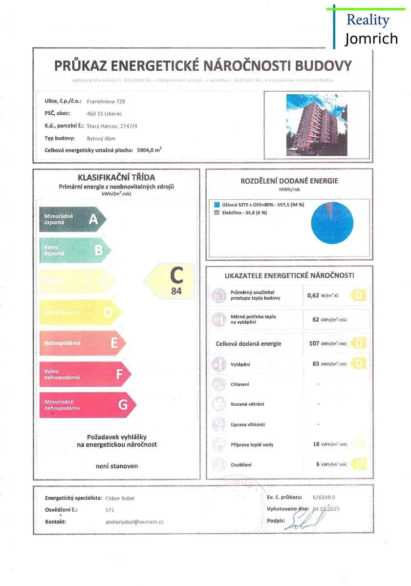 | Ukazatel energetické náročnosti | 84 kWh/m2 za rok |