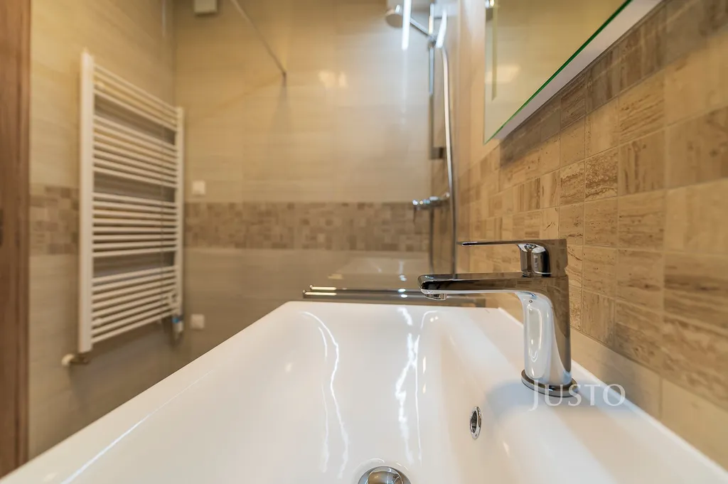 Koupelna: Automatická pračka Whirlpool, sprchový kout, umyvadlo a otopný žebřík.