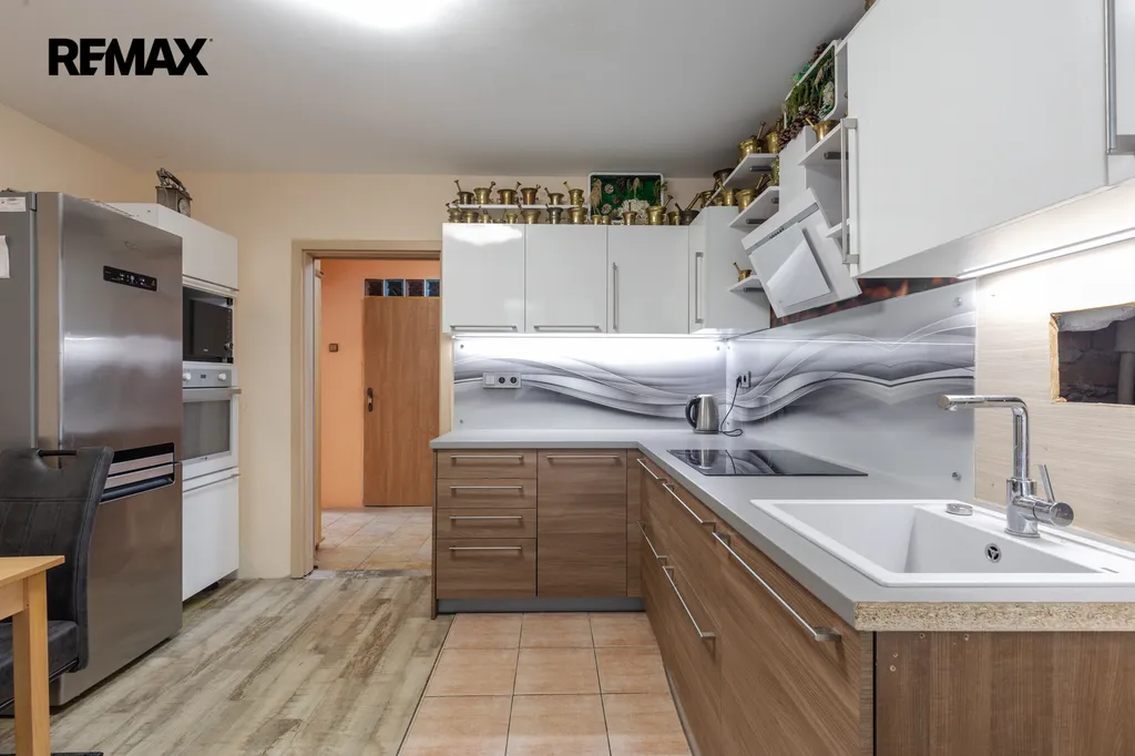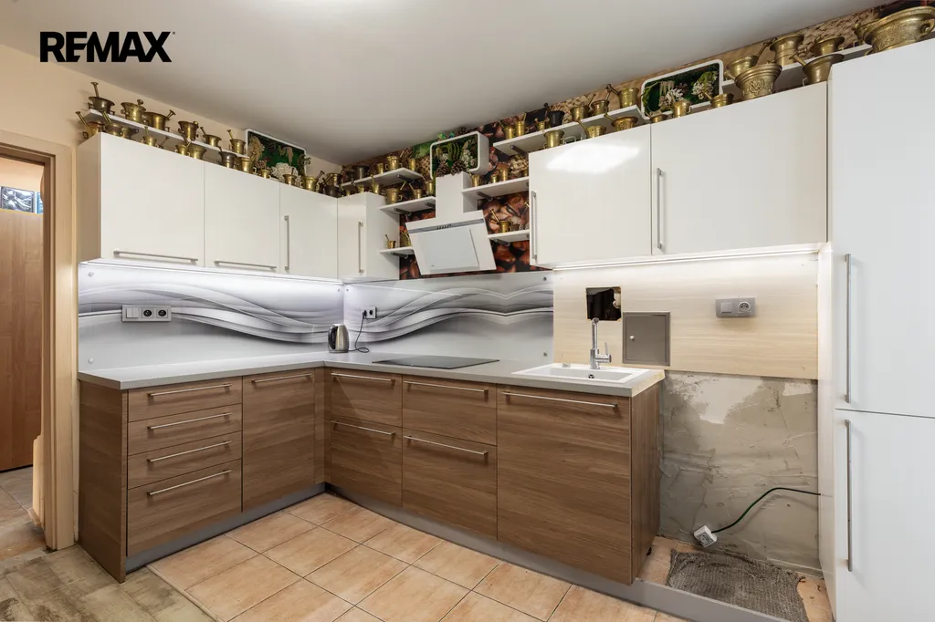 ✅ Kuchyšká linka ve tvaru L zhotovená na míru, / stáří 6 let/ vestavná elektrická multifunkční trouba, vestavná sklokeramická varná deska, komínová digestoř s recirkulací. Místo pro myčku / momentálně vyjmuta pro nefunkčnost/