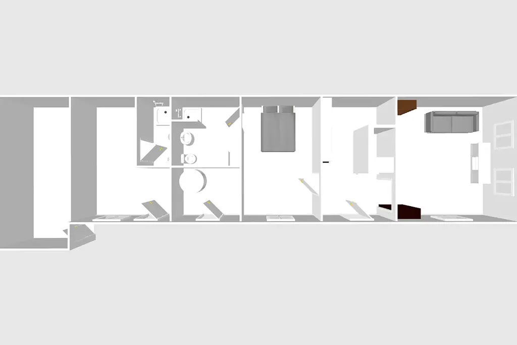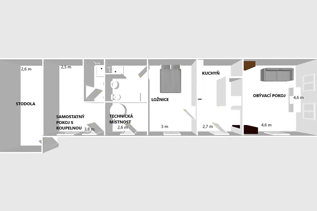 Dispozičně je dům řešen jako 2+1 a nabízí příjemný obytný prostor ideální pro jednotlivce, pár, rodinu nebo jako víkendové útočiště. Ze zádveří je vstup do malé chodby, která vede do obývacího pokoje. Ten je situován směrem do ulice. Navazuje na něj kuchyň a zádveří vede také do ložnice. Za ložnicí je koupelna se sprchovým koutem, umyvadlem a pračkou. Další samostatný pokoj s vlastní koupelnou, je přístupný ze dvora, rozšiřuje možnosti využití – může sloužit jako pokoj pro hosty, pracovna nebo menší apartmán.