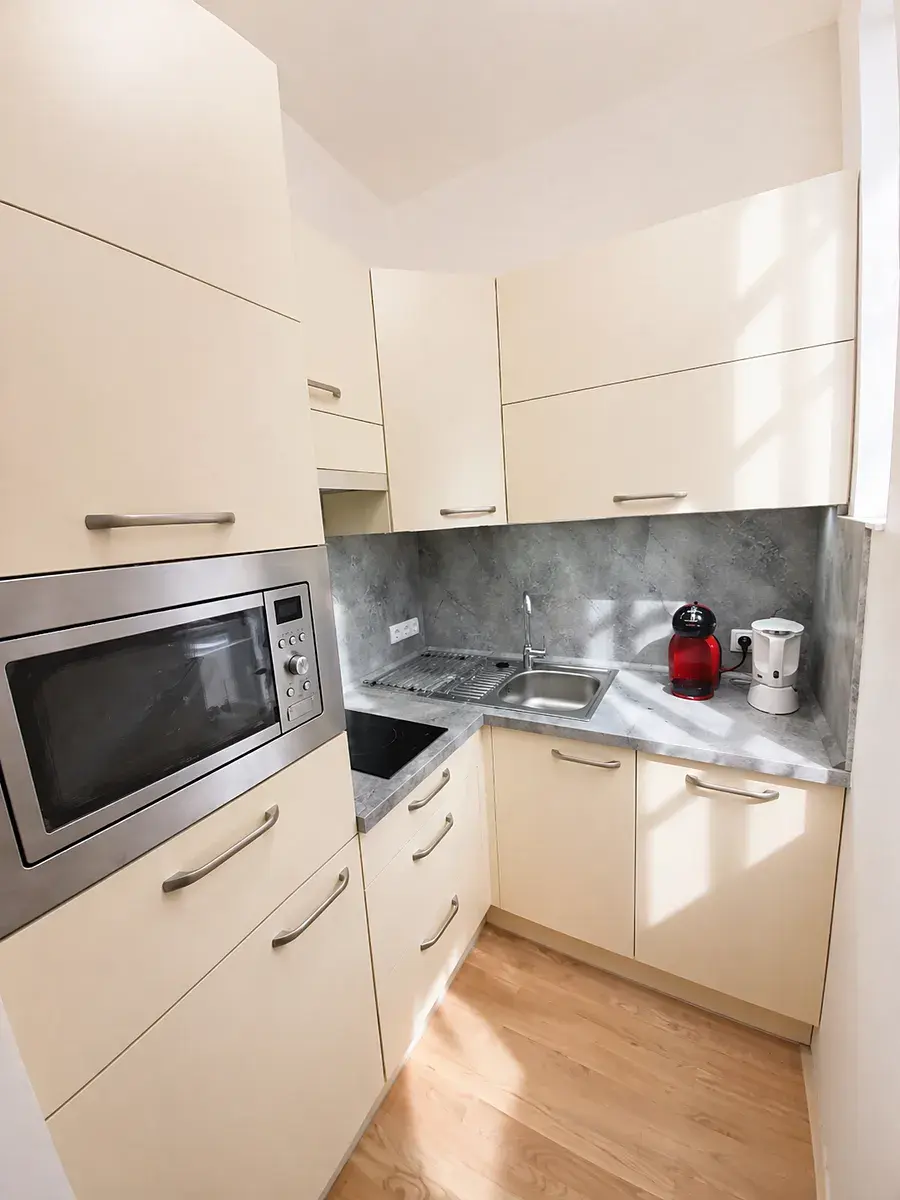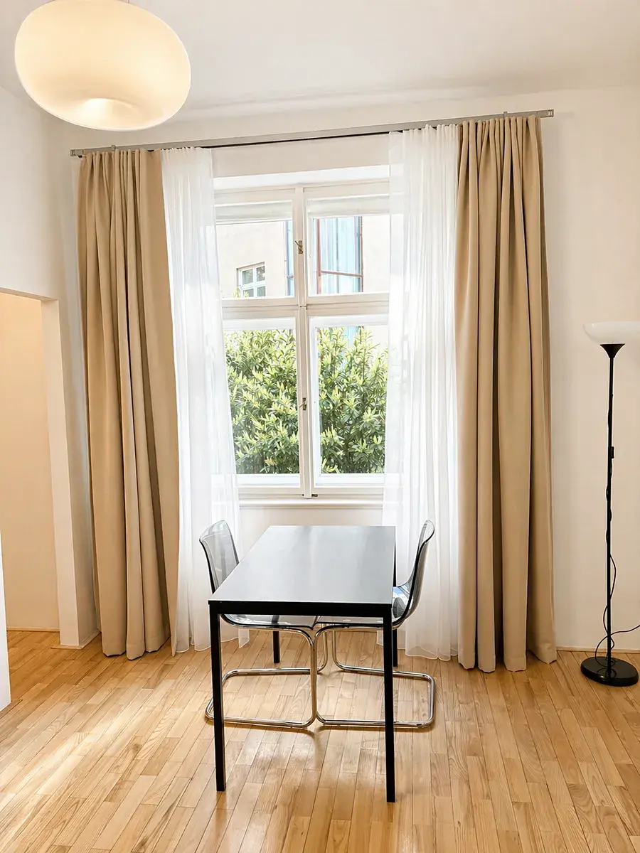 Obývací část je vybavena rozkládací pohovkou, která nabízí možnost pohodlného spaní. Interiér doplňují krásné béžové závěsy až na zem, které dodávají prostoru elegantní a útulnou atmosféru a zároveň umožňují v případě potřeby výrazné zatemnění bytu.