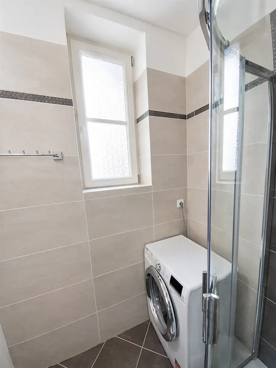 Byt o dispozici 2+1 a výměře 49 m² se nachází v 1. patře domu. Je plně vybavený – součástí je kuchyňská linka s vestavěnou myčkou, k dispozici je také pračka. V bytě je klimatizace pro komfortní bydlení v letních měsících.