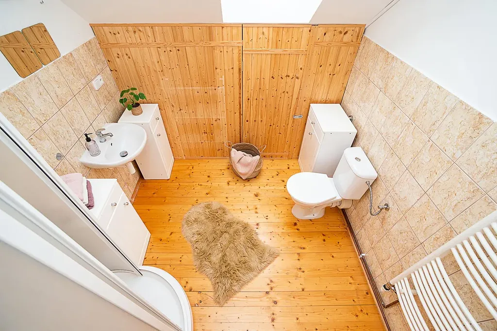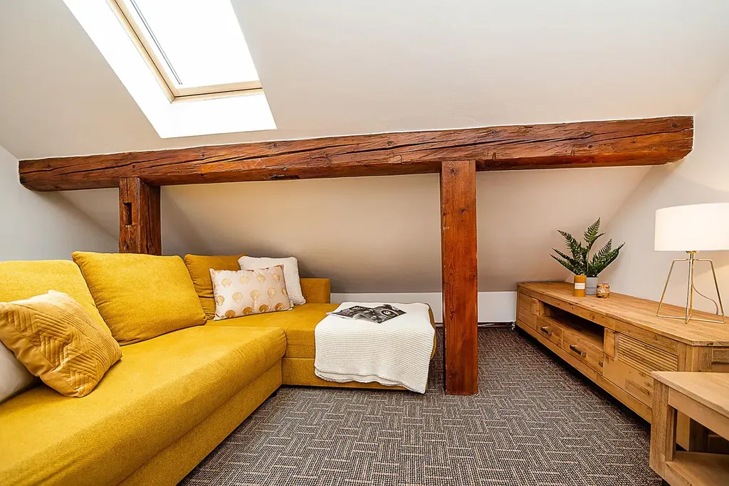Apartmán se nachází ve 3. NP a nabízí velkorysých 76 m² podlahové plochy (užitná plocha 58 m²). Díky šikminám působí interiér velmi útulně a horsky.