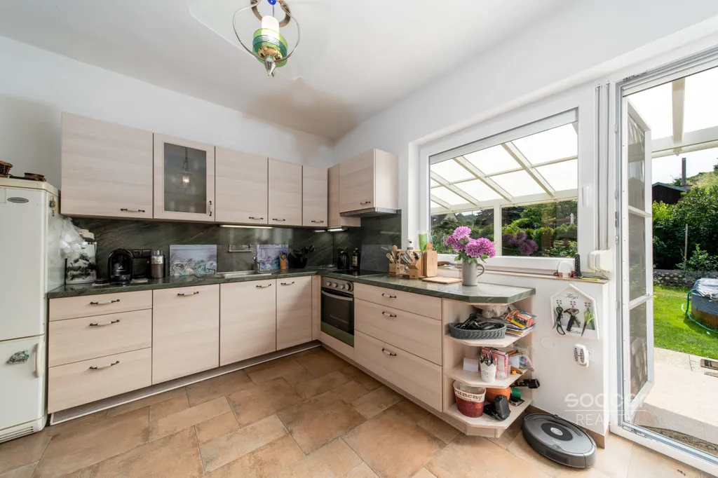 Dominantou domu je světlý obývací pokoj s kachlovými kamny, která vytvářejí příjemnou atmosféru a zároveň efektivně vytápí prostor. Na obývací část navazuje jídelna a kuchyně s plně vybavenou kuchyňskou linkou. Z kuchyně je vstup na zahradu a terasu, ideální pro relaxaci nebo posezení s rodinou a přáteli. Dalším benefitem je krytá terasa s krásným výhledem do okolí.