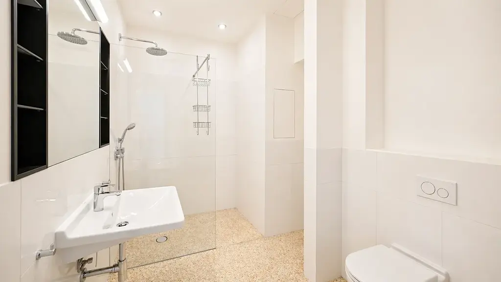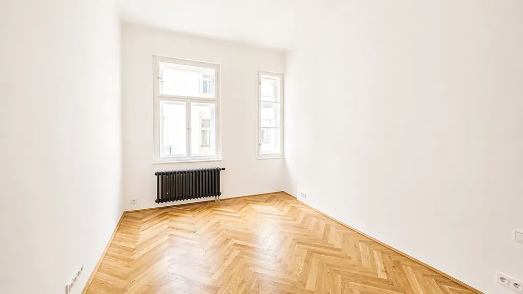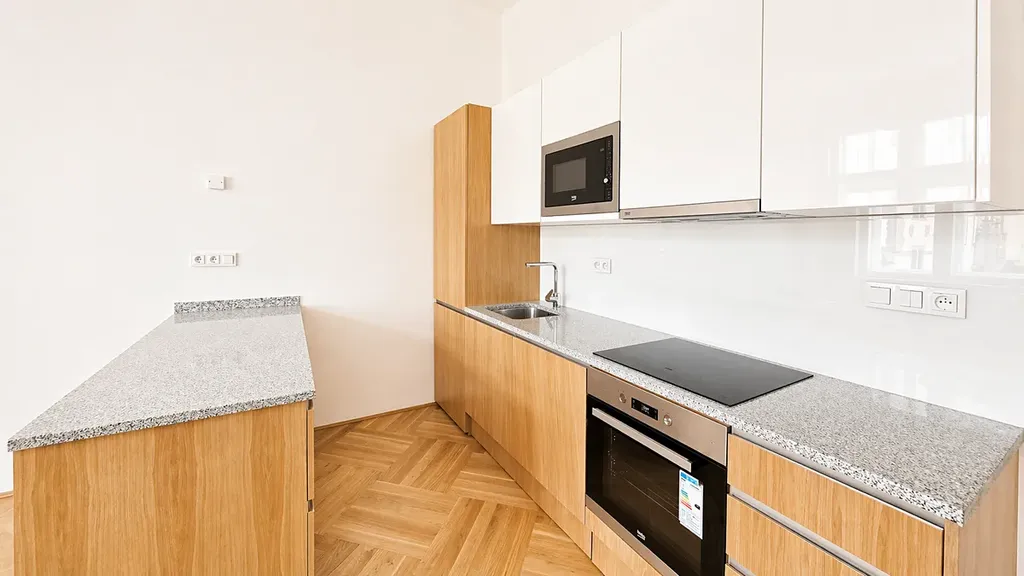 Byt nabízí ideální kombinaci historického kouzla a moderního komfortu. Dominantou je designová kuchyňská linka na míru s kompletně vestavěnými spotřebiči (indukční varná deska, horkovzdušná trouba, lednice s mrazákem, myčka nádobí), která splňuje požadavky i náročného klienta. Podlahy tvoří kvalitní dřevěné parkety v kombinaci s velkoformátovou dlažbou, které podtrhují nadčasový charakter bytu.