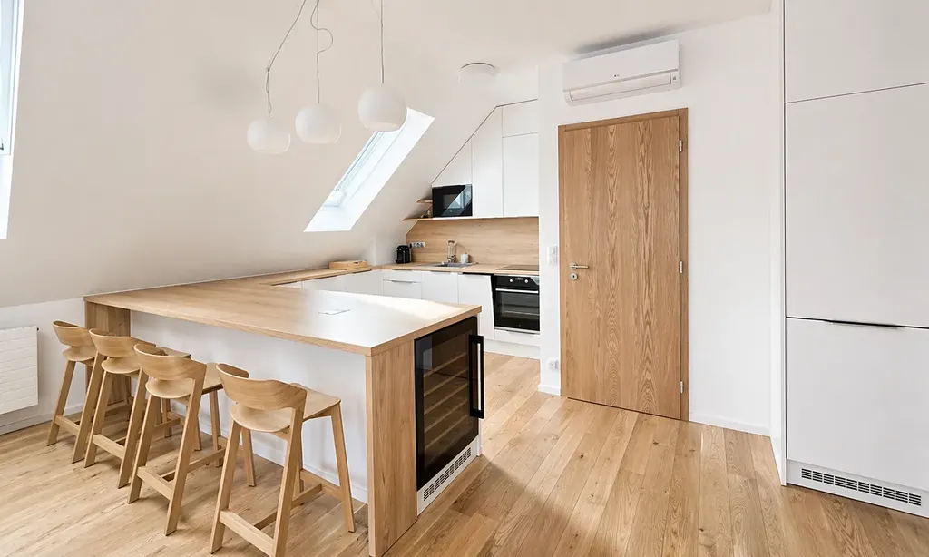 Byt splňuje nároky na moderní a komfortní bydlení ve vysokém standardu. Dominantou interiéru je moderní kuchyňská linka vyrobená na míru, vybavená kvalitními vestavěnými spotřebiči – indukční varnou deskou, horkovzdušnou troubou, myčkou nádobí, lednicí s mrazákem, mikrovlnnou troubou, drtičkou odpadu a dalším praktickým vybavením.
