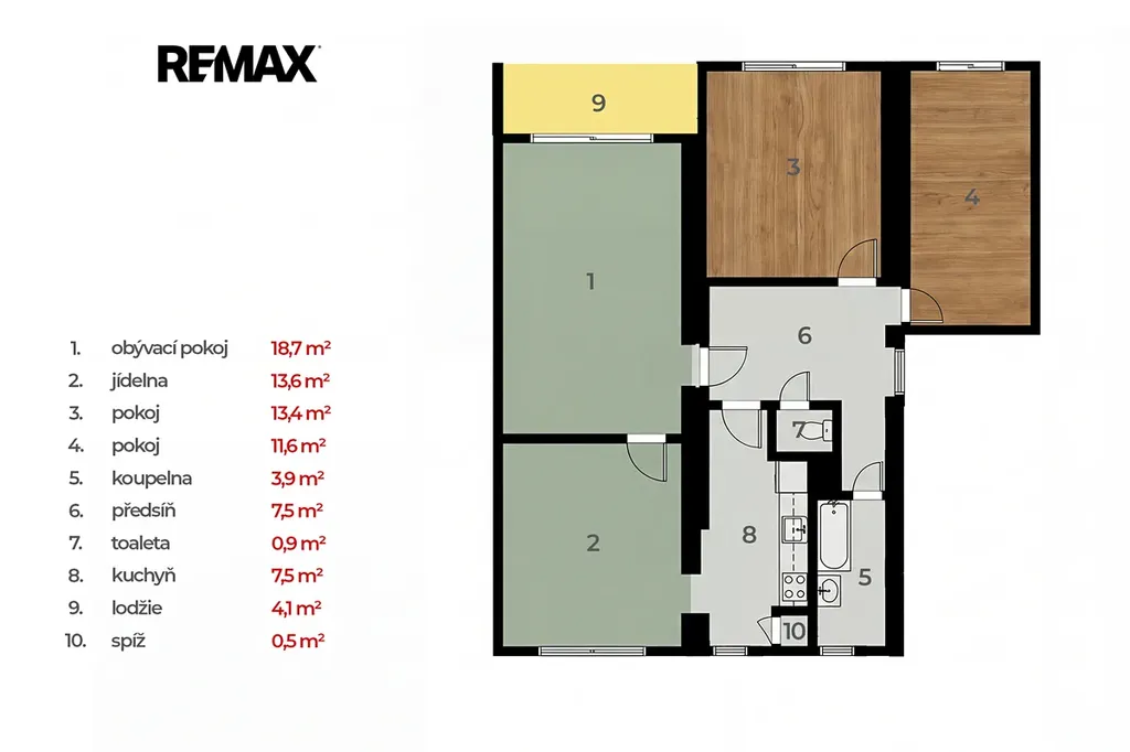 Dispoziční řešení bytu: Kuchyně se spíží, 4x pokoj, koupelna, samostatné WC, předsíň, lodžie. K bytu náleží prostorný sklep. Celková výměra zahrnuje lodžii a sklep. Podrobné rozkreslení včetně rozměrů naleznete v přiloženém půdorysu.