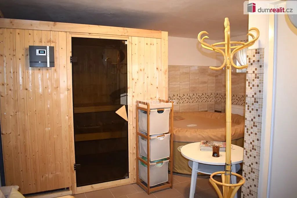 Suterén - prádelna s rohovou vanou, technická místnost s plynovým kotlem, sauna, posilovna, myslivna a sklad.