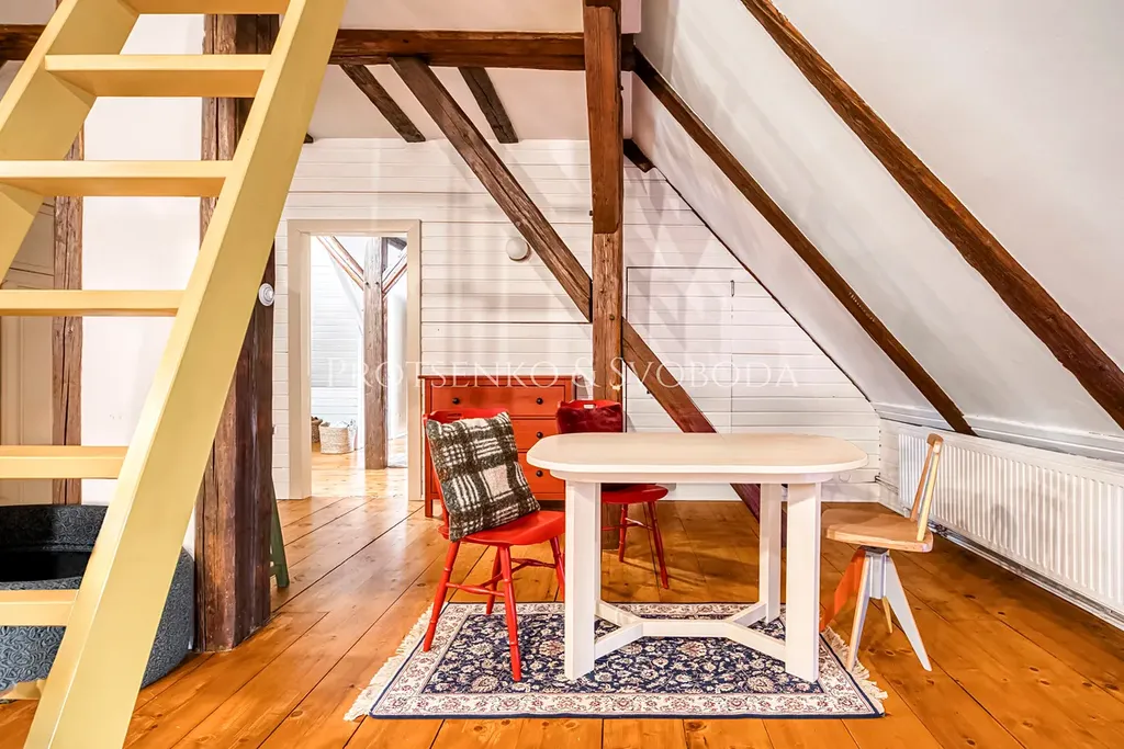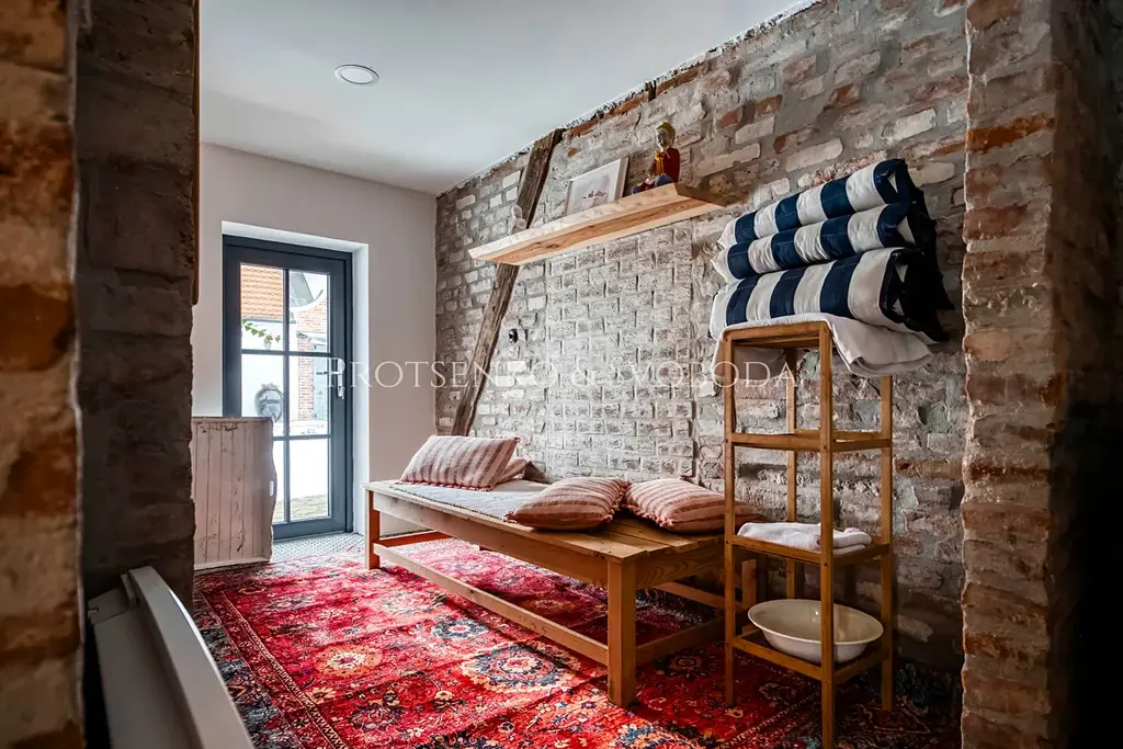Zachované původní trámy, masivní dřevo, přirozené materiály, ruční detaily a světlo, které prostupuje každým koutem. Interiér je promyšlený do posledního detailu – propojuje historický charakter s komfortem moderního bydlení.