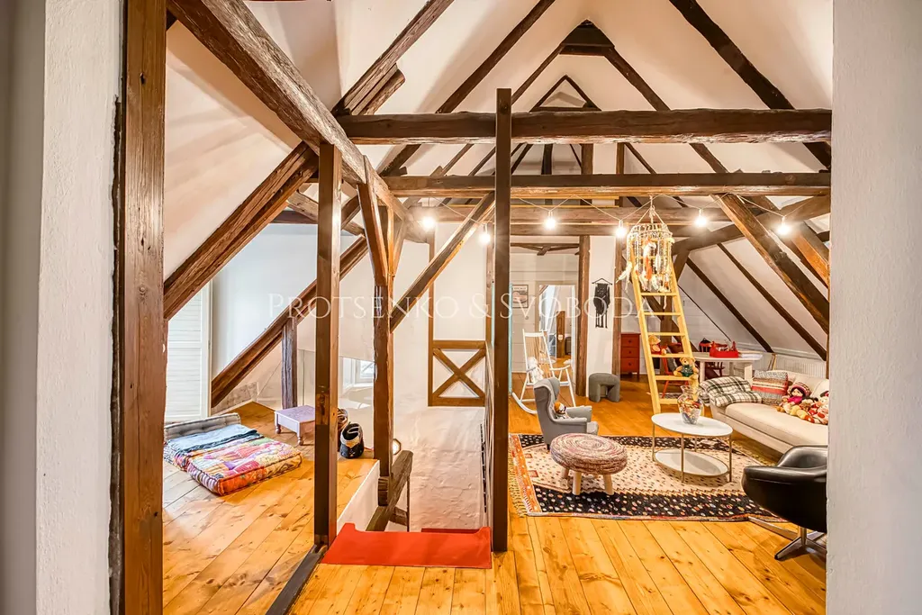 Velkým benefitem je také obytná půda se dvěma ložnicemi, která rozšiřuje obytný prostor a nabízí soukromí pro rodinu, hosty nebo pracovní zázemí.