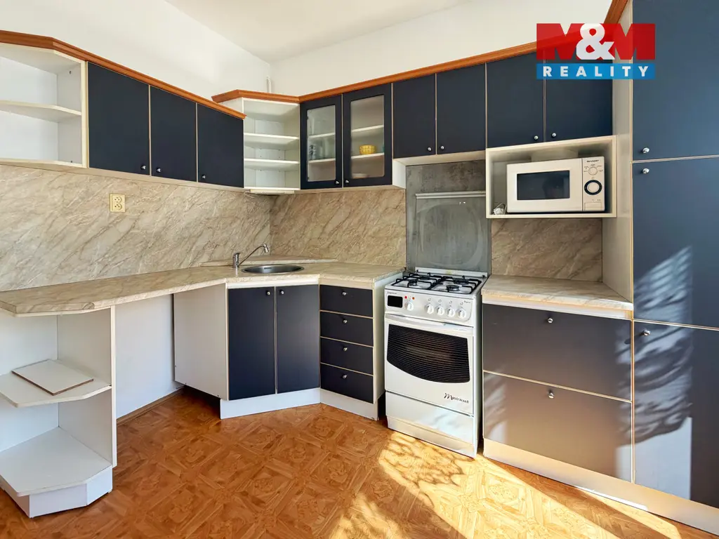 Velký obývací pokoj je prakticky rozdělen příčkou na obytnou a klidovou spací část, což zajišťuje komfortní a funkční využití prostoru. Kuchyně je prostorná a nabízí dostatek místa pro vaření i stolování.