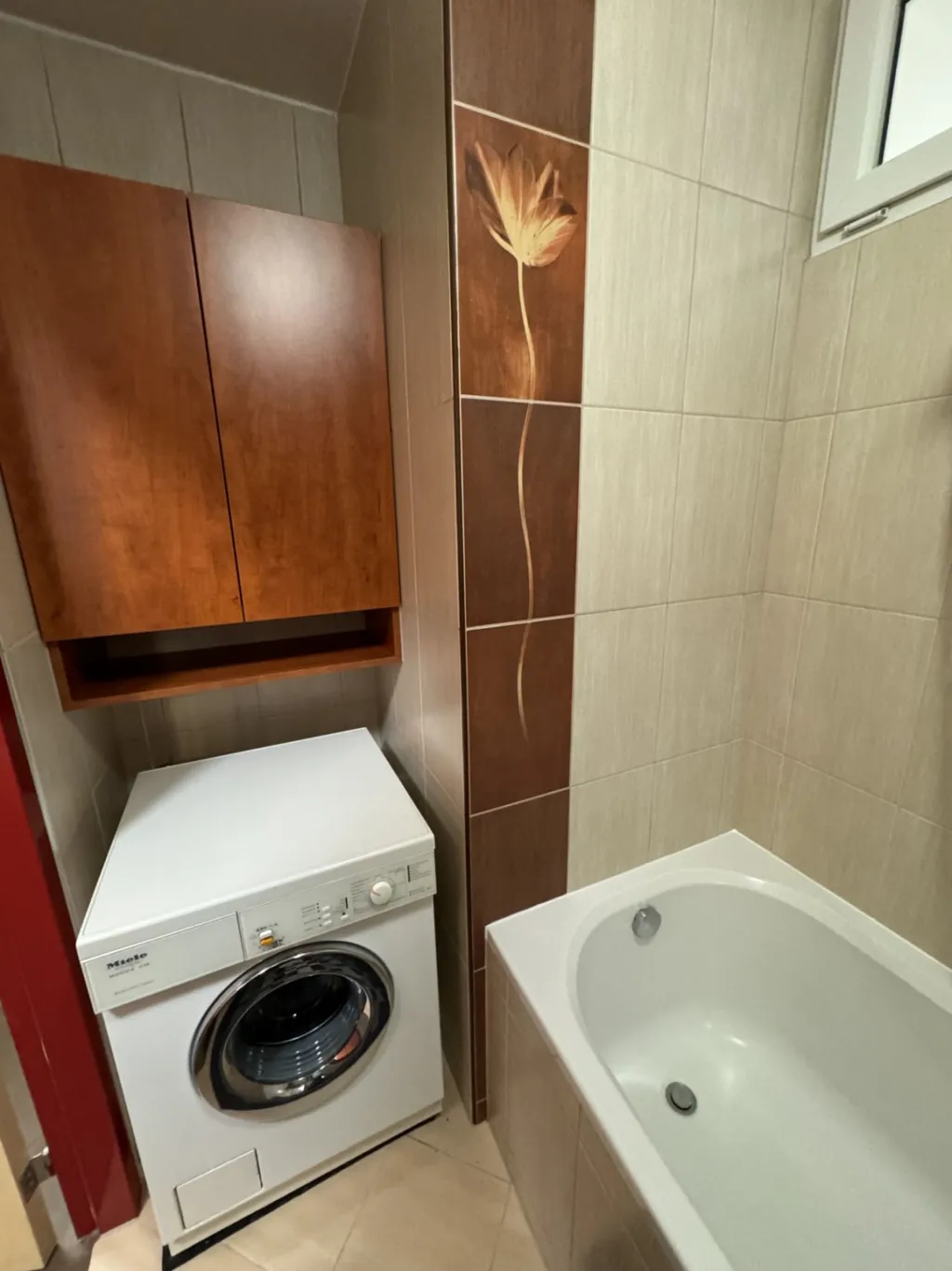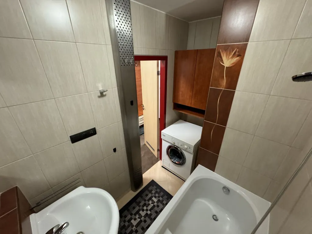 Koupelna disponuje vanou, umyvadlem s vestavěnou skříňkou a osvětlením. Pračka je součástí koupelny. Nad pračkou je také úložný prostor. Toaleta je odděleně.