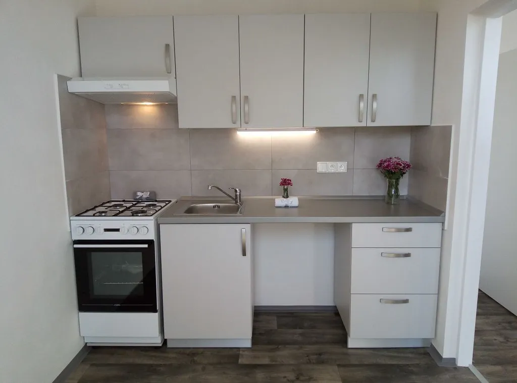 Kuchyňská linka je opatřena plynovým sporákem a elektrickou troubou s možností připojení pračky.