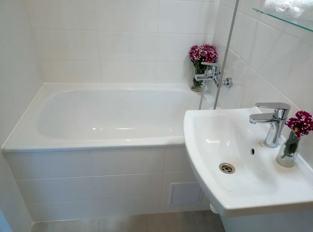 Koupelna s vanou a umyvadlem a s osvětlením, toaleta je součástí koupelny oddělená přepážkou.