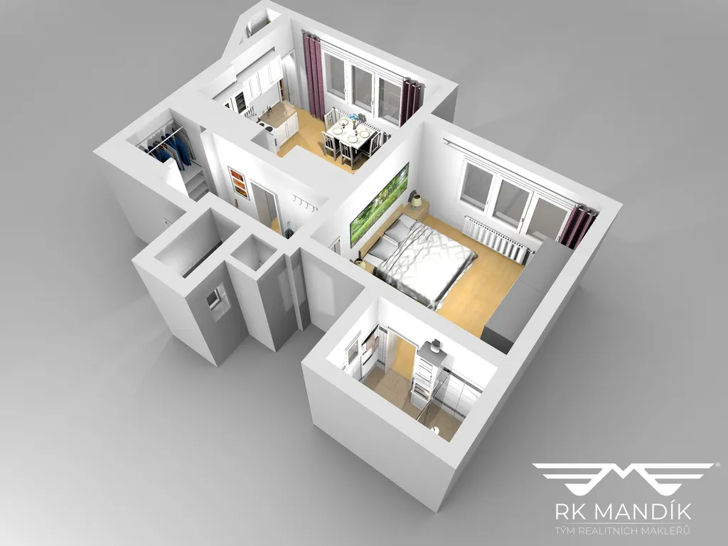 Interiér bytu je v původním udržovaném stavu, částečně zařízen a připraven k nastěhování v květnu tohoto roku. Dispozičně je řešen vstupní chodbou s šatnou o ploše 7,19 m², na kterou navazuje samostatný prostor pro uskladnění oblečení 0,52 m². Obývacímu pokoji s kuchyňským koutem (17,48 m²) dominuje plně vybavená kuchyňská linka s plynovým sporákem a lednicí, přičemž z této části je přístupná komora s policovým systémem o ploše 0,77 m². Ložnice 18,32 m² nabízí dostatečné množství úložných prostor ve vestavěných skříních. Součástí bytu je rovněž koupelna 4,07 m² přístupná z ložnice, vybavená sprchovým koutem a plynovým kotlem.