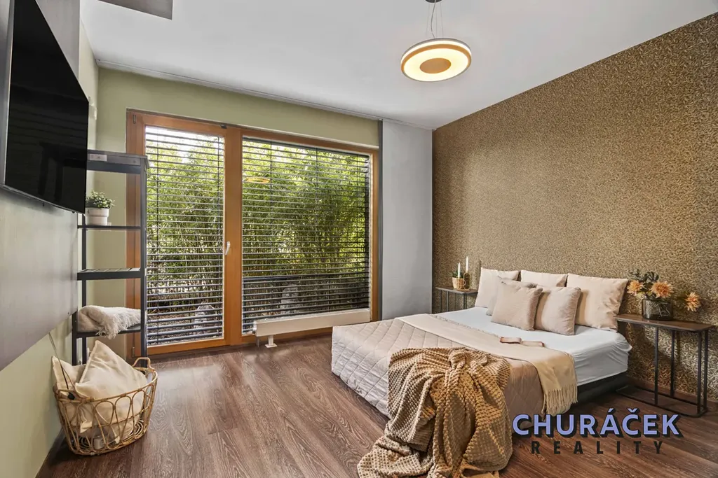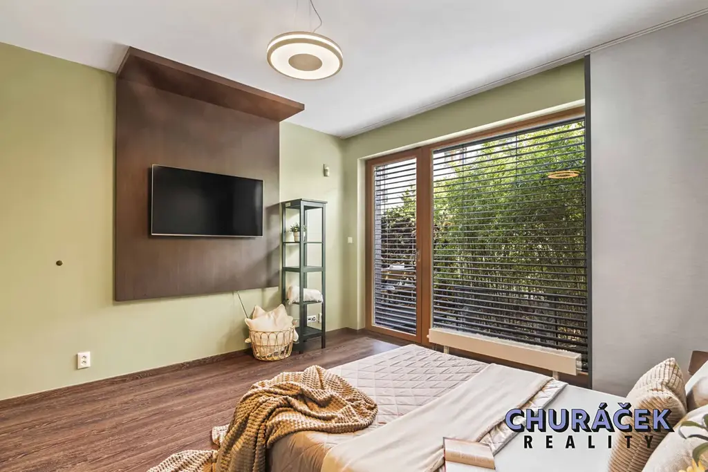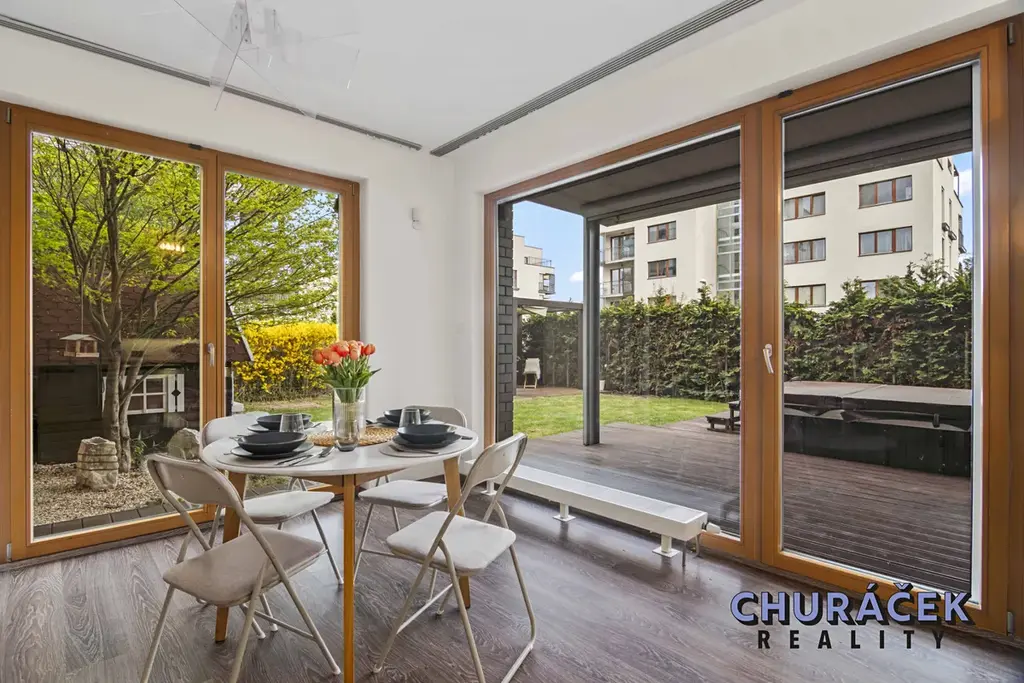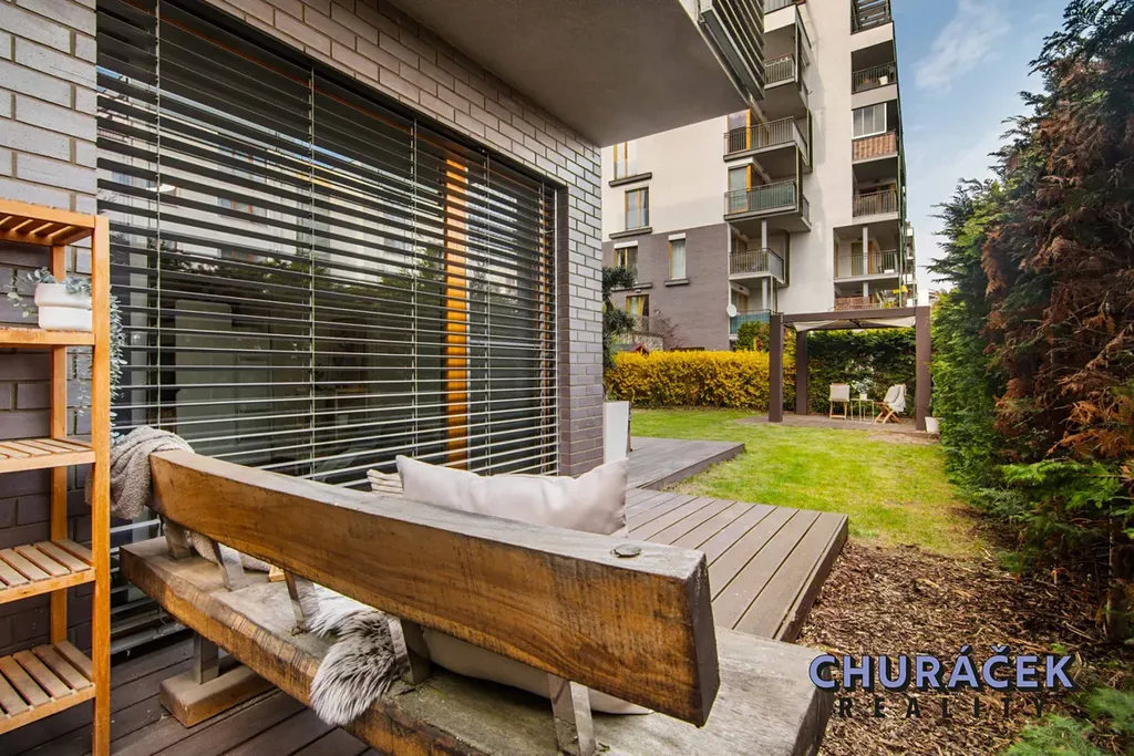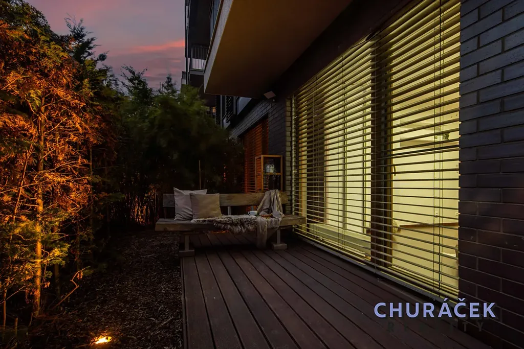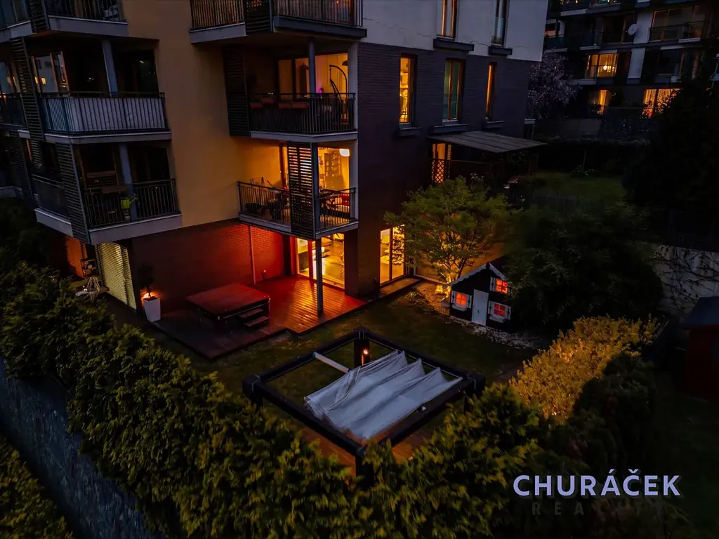 Byt má celkovou podlahovou plochu téměř 100 m² a je doplněn o soukromou předzahrádku o velikosti přibližně 200 m². Ta nabízí skutečný pocit soukromí, jelikož je situována ve vyvýšené části cca 4 metry nad okolním terénem. Zahrada je vybavena altánem, dětským domečkem, prostornou vířivkou a dále prvky zvyšujícími komfort užívání, jako je elektricky ovládaná pergola, venkovní osvětlení, stínění či sítě proti hmyzu.