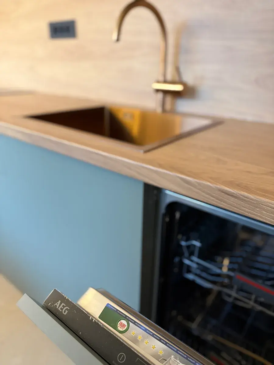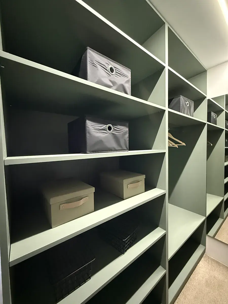 Veškerý nábytek byl vyroben na míru truhlářem, interiérové dveře jsou rovněž zakázkové. Celek působí čistě, jednotně a nadčasově – bez improvizací a levných řešení.