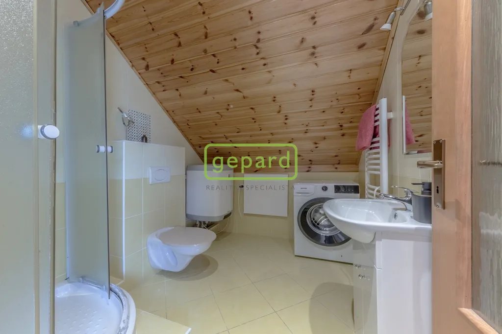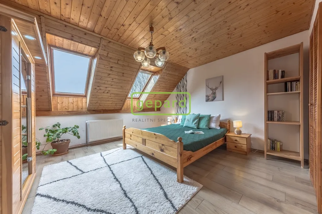 V patře najdete klidovou zónu domu – hlavní ložnici s vlastní koupelnou, šatnou a dokonce i infrasaunou. Dva další pokoje snadno poslouží jako dětské pokoje nebo pracovna. Bonus navíc? Krytá lodžie, ideální na ranní kávu nebo večerní klid.