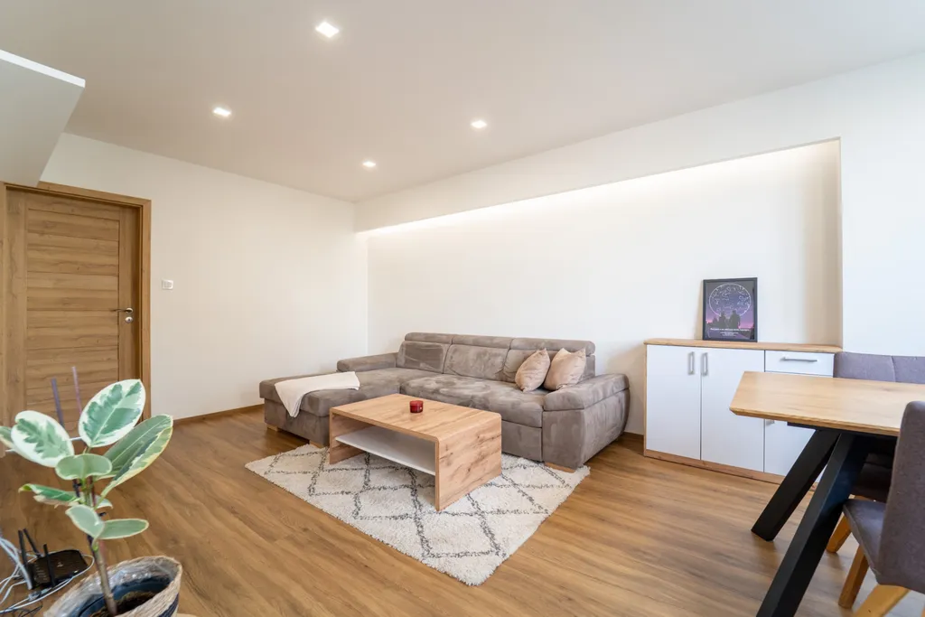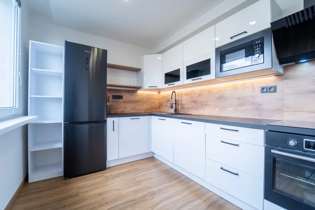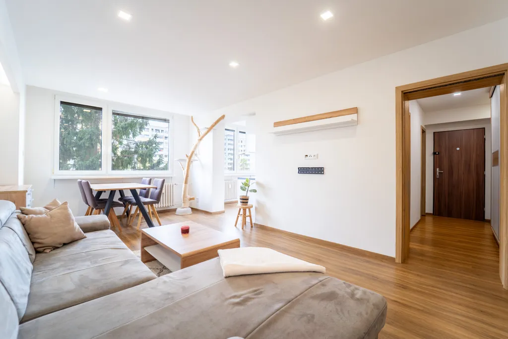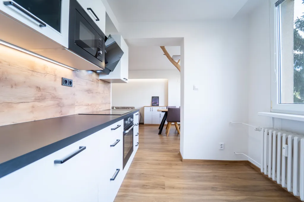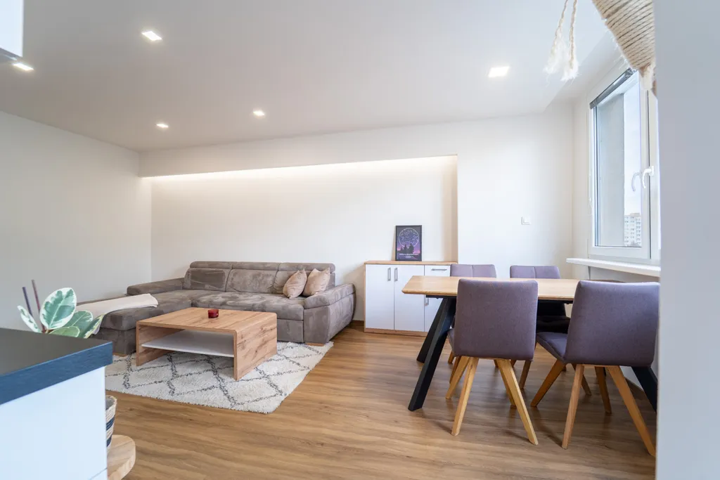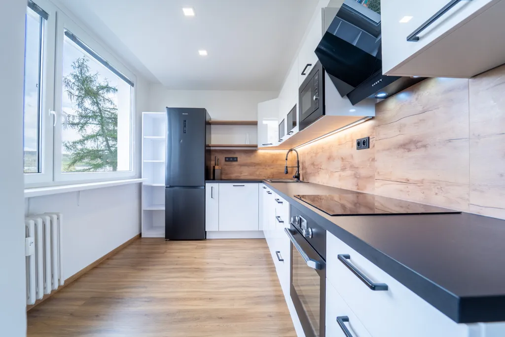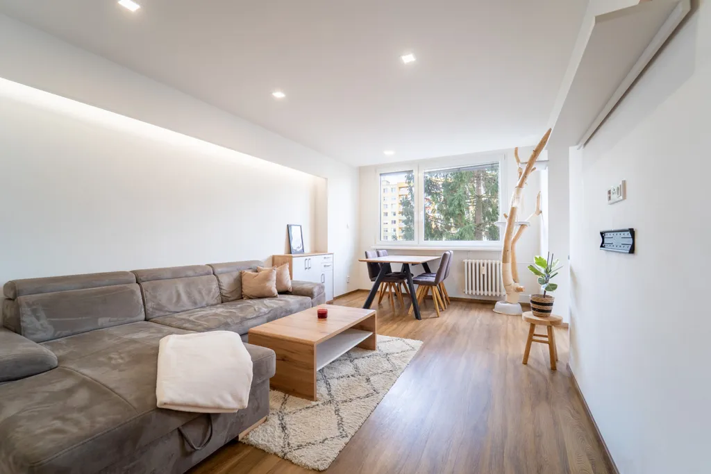 Byt prošel v roce 2021 kompletní rekonstrukcí (nové rozvody elektřiny, vody i odpadů, nové příčky, stropní podhledy s izolací). V obytných místnostech je jednotná vinylová podlaha, v předsíni praktické vestavěné úložné prostory s podsvícením. Kuchyňská linka je plně vybavena spotřebiči (lednice, trouba, indukční deska, myčka, mikrovlnná trouba). Z ložnice je vstup na zasklenou lodžii.