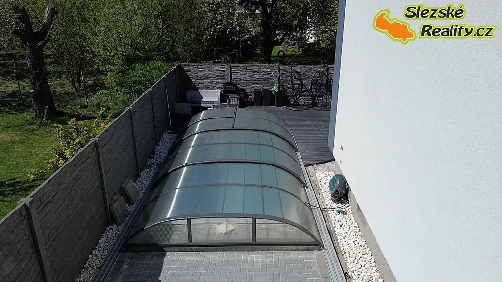 Za domem se nachází odpočinková zóna s krytým bazénem a pergolou vhodnou pro grilování. Ve sklepních prostorách je k dispozici posilovna a společenská místnost vhodná k posezení i pořádání oslav. Součástí je také toaleta, menší kuchyňka, dílna a další úložné prostory.