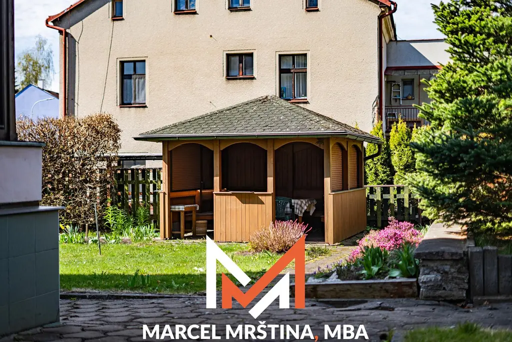 Dům je obklopen udržovanou, vzrostlou zahradou s příjemnými zákoutími, altánem a přívodem vody. Terén zahrady je členitý a dodává prostoru přirozený charakter a soukromí.