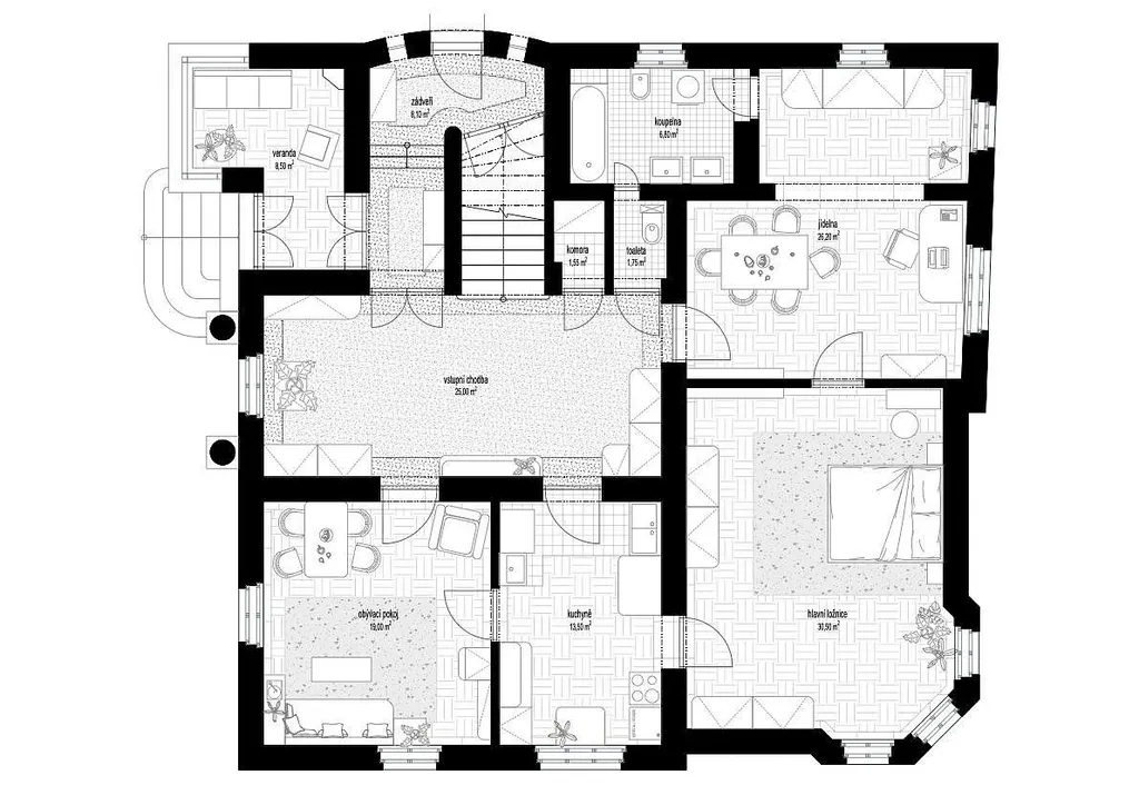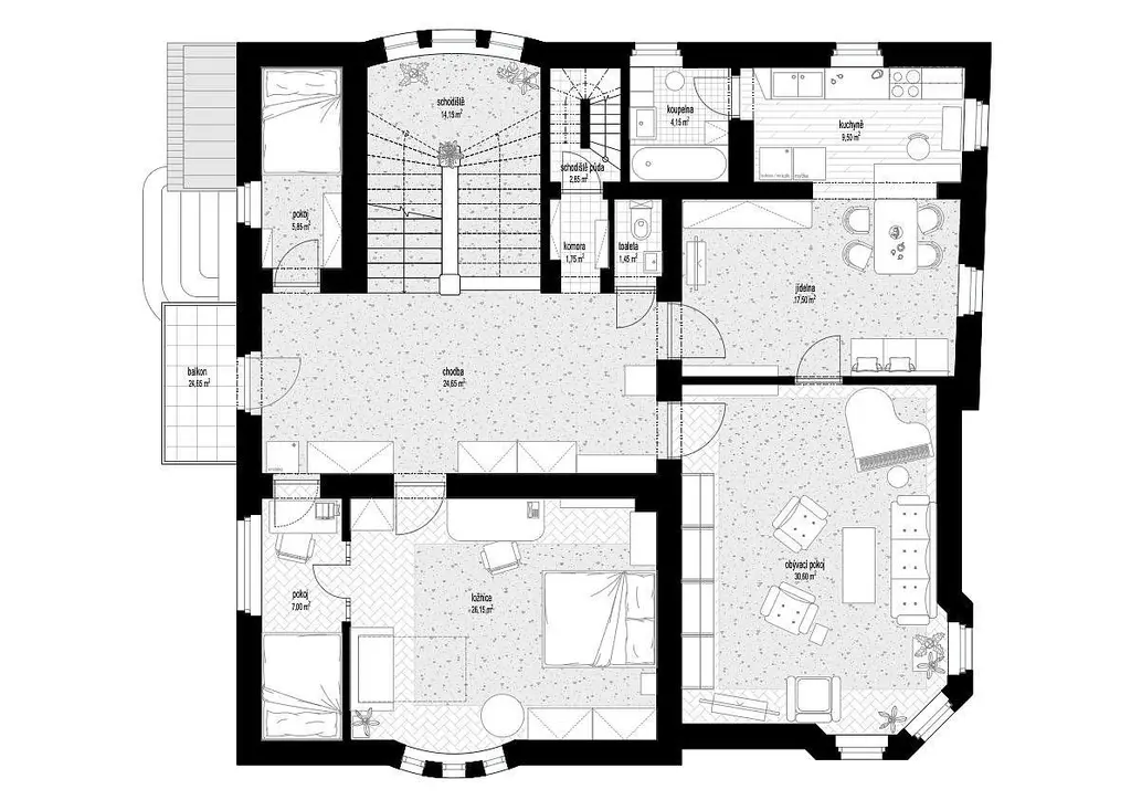 - Centrální chodba, tři prostorné pokoje, dva menší pokojíky, koupelna s toaletou, komora a balkon.