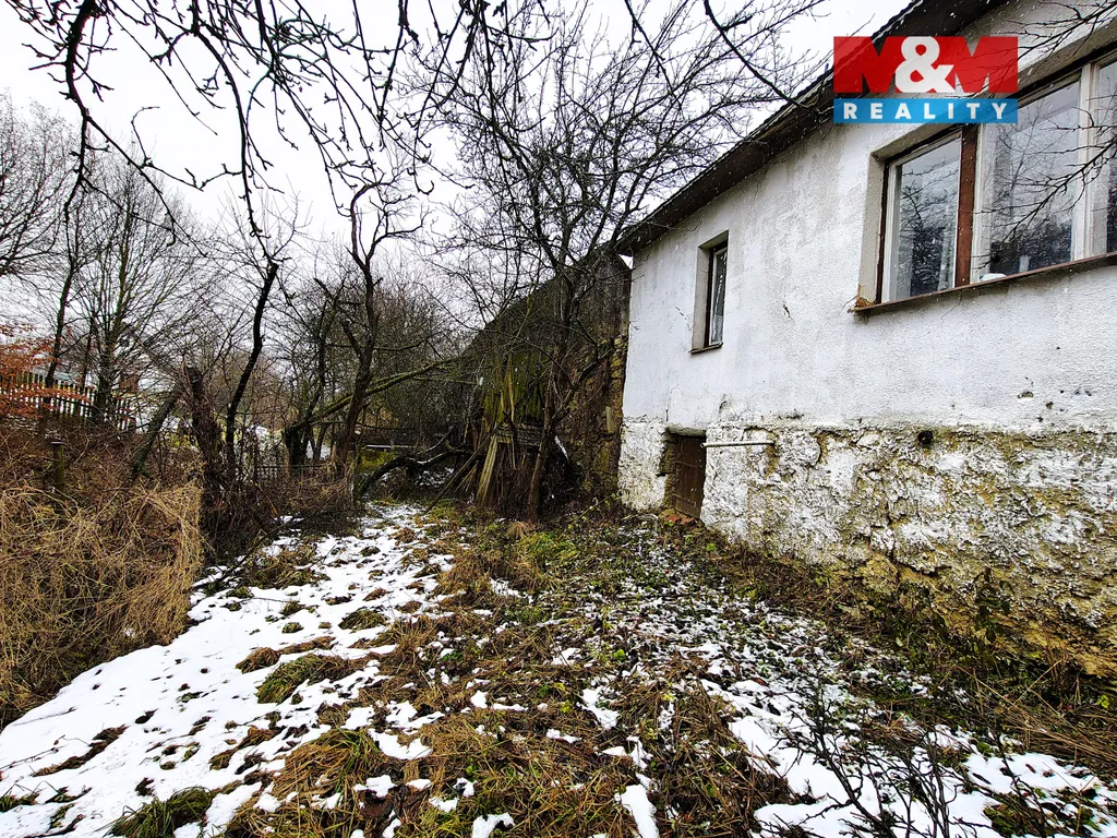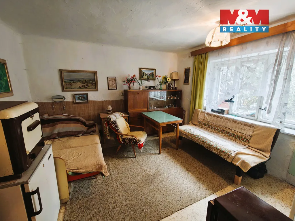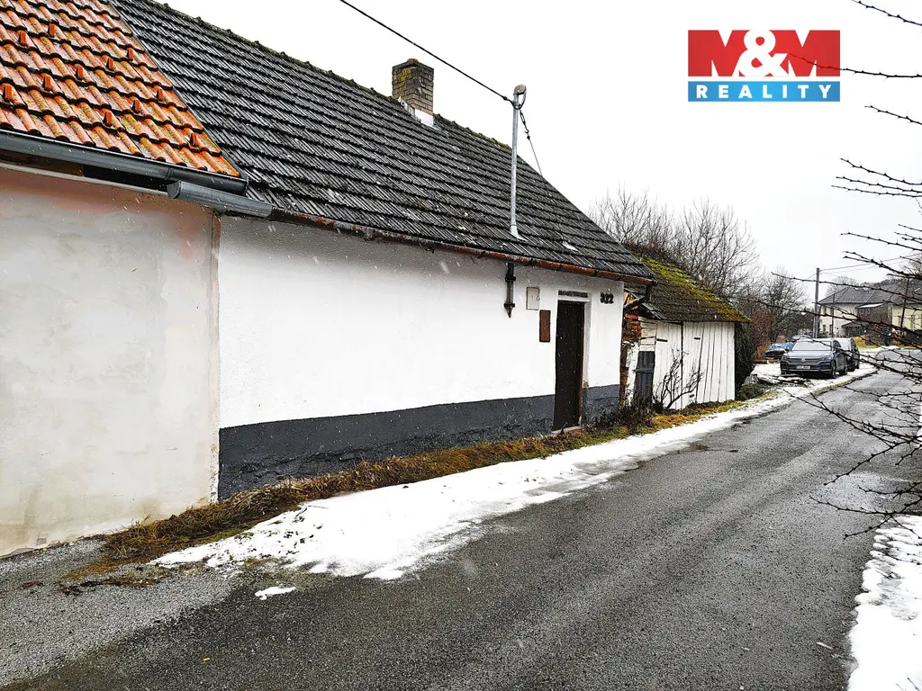 Dům je v původním stavu, před rekonstrukcí, s malou zahrádkou — ideální jako rekreační objekt nebo po úpravách k trvalému bydlení.