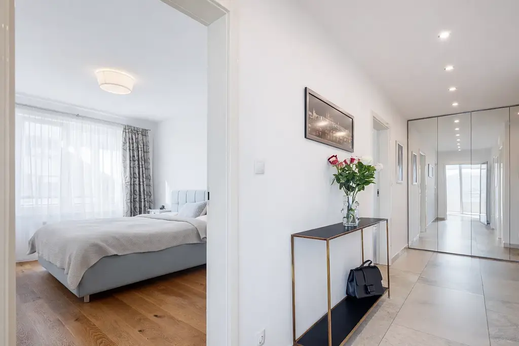 Byt dále nabízí dvě samostatné ložnice s výhledem do zmiňovaného vnitrobloku, koupelnu s vanou, separátní toaletu, dále chodbu ze které je vstup do všech místností, předsíň s vestavěnými skříněmi a praktickou komoru s pračkou a sušičkou značky Miele.