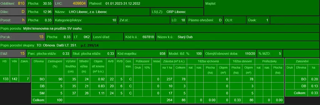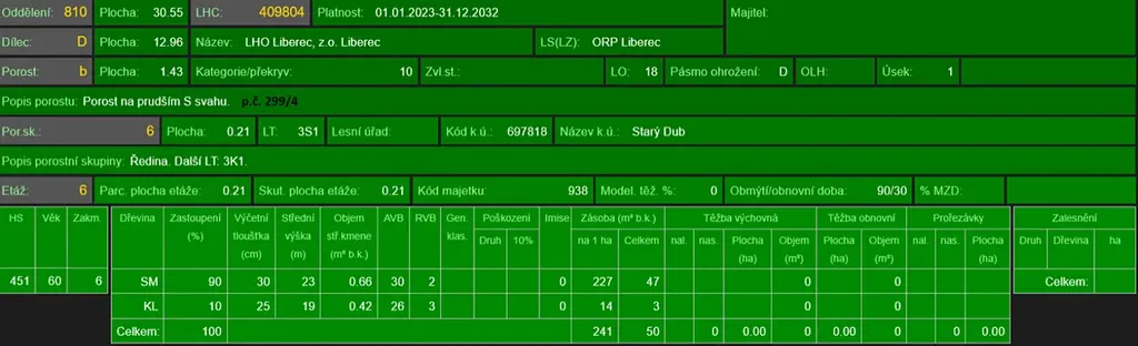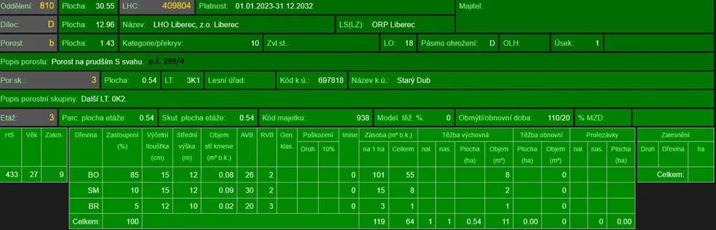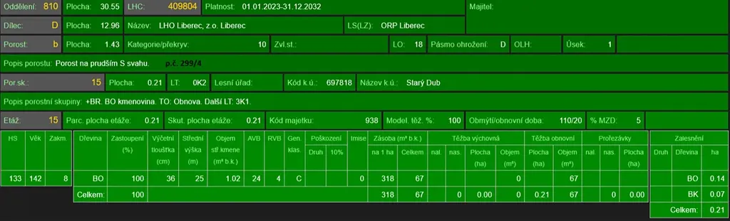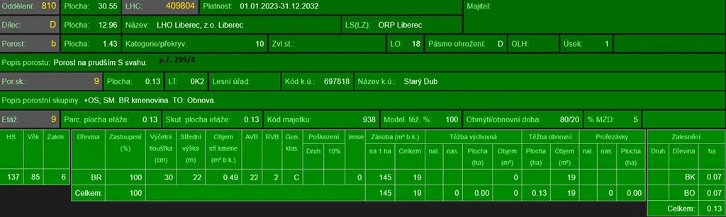 - p.č. 299/4 vedená jako lesní pozemek o celkové výměře 14 211 m2 (stáří lesa 145 let - zastoupení dřevin borovice, stáří lesa 88 let - zastoupení dřevin bříza, stáří lesa 63 let - zastoupení dřevin smrk, javor, stáří lesa 30 let - zastoupení dřevin borovice, smrk, bříza),
