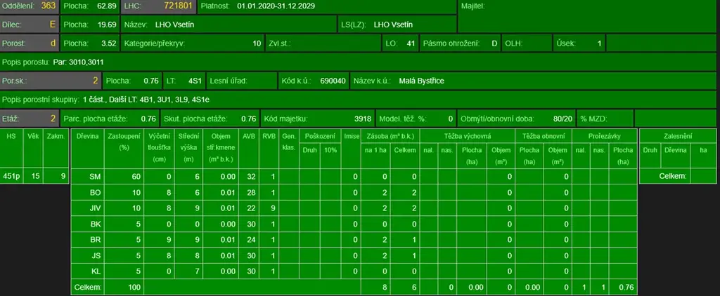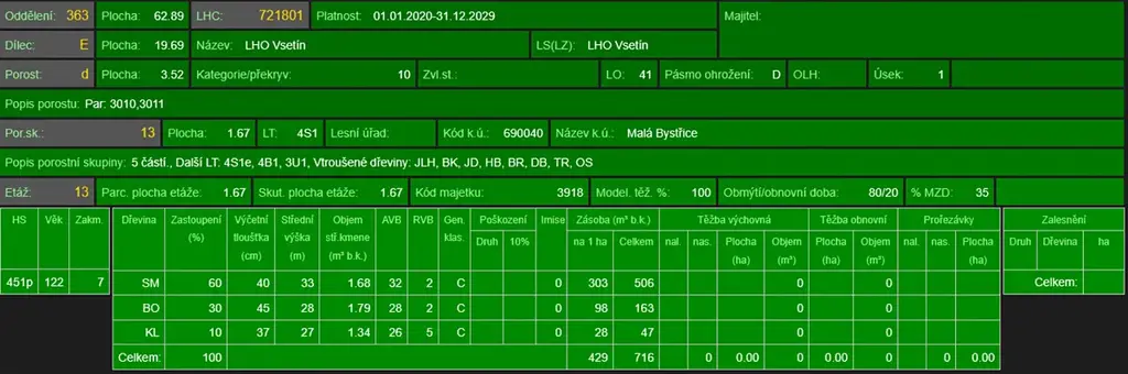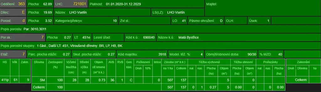 - p.č. 3011 vedená jako lesní pozemek o celkové výměře 22 144 m2, z toho vlastníme podíl 17/72 tedy 5 228 m2 (stáří lesa 128 let - zastoupení dřevin smrk, borovice, javor, stáří lesa 67 let - zastoupení dřevin smrk, stáří lesa 21 let - zastoupení dřevin smrk, borovice, vrba, buk, bříza, jasan, javor),
